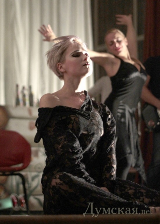 Виктория играет любовницу отсутствующего персонажа, актрису Амели, ей Стриндберг речей не написал. Фонтанирует фразами другой персонаж — тоже актриса и по совместительству законная жена загадочного господина. Эту роль и реплики поделили между двумя исполнительницами — Елизаветой Рарог (актриса и хореограф «Нового театра», самая длинноволосая и изящная в коллективе, похожая на готическую мадонну) и Татьяна Бабченко — тоже нерядовая девушка!
