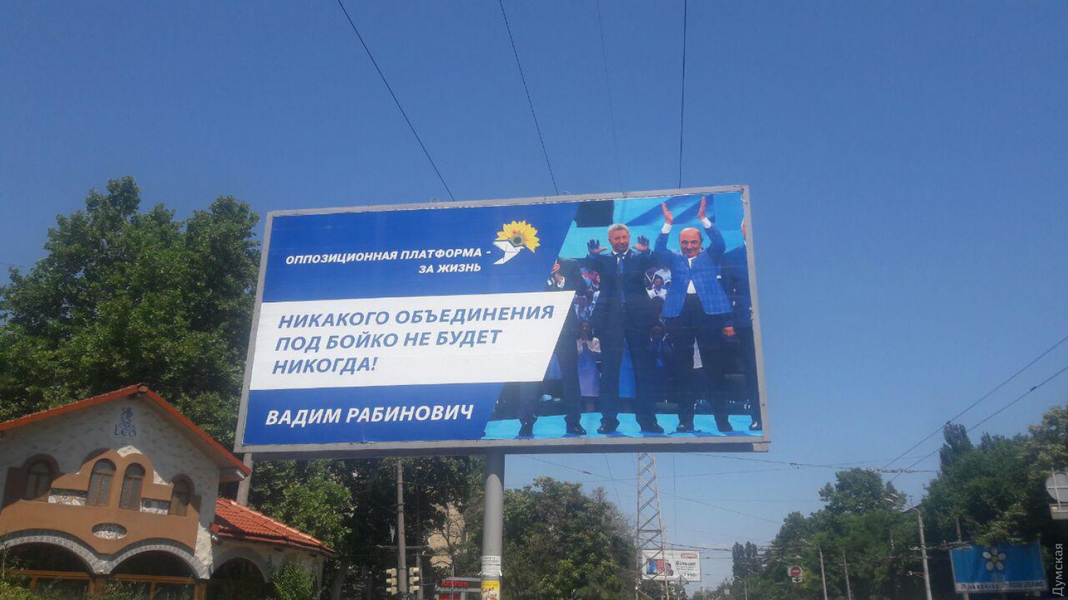 Впервые борды с изображением кандидатов в депутаты от «Оппозицонной платформы «За жизнь» Вадима Рабиновича и Ильи Кивы появились на улицах Одессы больше недели назад.