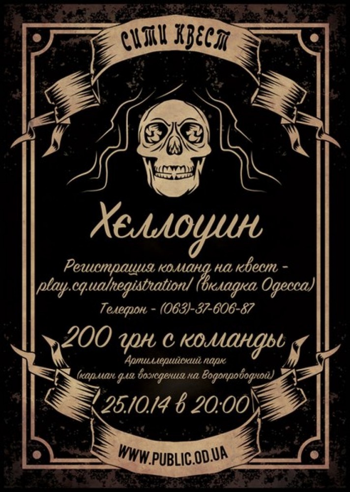 В субботу, 25 октября, в Одессе пройдет автоквест под названием «Хэллоуин». Сбор участников, как обычно, назначен на 20:00 в Артиллерийском парке, со стороны Водопроводной. «Сити Квест – командная развлекательная игра в реальном мире, во время которой ваша команда будет решать загадки, перемещаться по городу и выполнять разные задания», — отмечают организаторы. Правила игры прежние – команды состоят из 3-5 человек. Участникам понадобится выход в интернет, фонарики, знание старых и новых названий улиц, скверов, бульваров и т.д., знание города, «ДубльГис», хорошее настроение. Все подробности — в группе. СМЕРТЬ РОСІЙСЬКИМ ОКУПАНТАМ! Помітили помилку? Виділяйте слова з помилкою та натискайте control-enter |