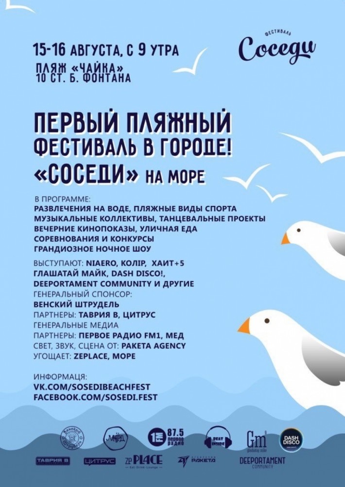 15 и 16 августа на территории пляжа «Чайка» (10-я станция Большого Фонтана) пройдет первый в городе пляжный фестиваль «СОСЕДИ на море!» «Фестиваль по праву может называться уникальным, так как в нашем городе подобного еще не проводили», — говорится в анонсе. В июне организаторы проводили фестиваль семейной культуры для жителей Суворовского района на территории детского центра «Молодая гвардия». Тогда фестиваль посетили более 7 тысяч человек. На этот раз организаторы берут планку выше и организовывают большой праздник для всего города — в лучших традициях пляжного отдыха Одессы. «На протяжении двух дней и одной ночи вас ждут самые захватывающие водные аттракционы и пляжные виды спорта, разнообразие музыкальных коллективов и лучших танцевальных проектов нашего города, невиданные ранее шоу программы, кинопоказы под открытым небом, всевозможные конкурсы и розыгрыш ценных призов, а также фирменные блюда и напитки от одесских ресторанов», — отмечают организаторы. Фестиваль пройдет с 9 утра 15 августа по 22:00 16 августа. СМЕРТЬ РОСІЙСЬКИМ ОКУПАНТАМ! Помітили помилку? Виділяйте слова з помилкою та натискайте control-enter |