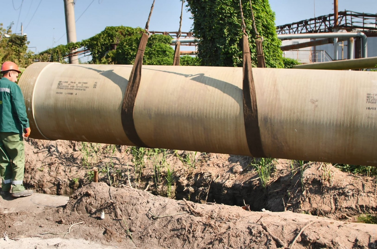 Всего здесь проходит три трубопровода. Один из них уже обновили в прошлом году. Сейчас меняют почти километр трубопровода диаметром 1400 мм. Вместо старой трубы, которая отработала свой эксплуатационный лимит, прокладывают почти километр новой стеклопластиковой трубы диаметром 1200 мм турецкого производства.