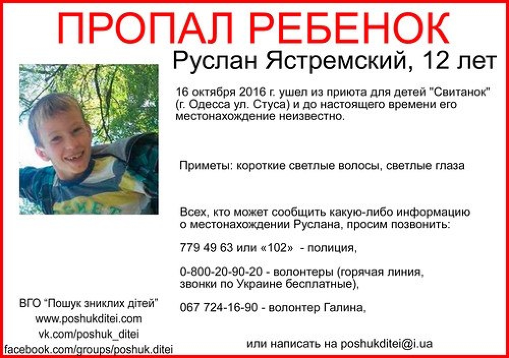 Одесская полиция разыскивает 12-летнего Руслана Ястремского, который 16 октября ушел из приюта для детей «Свитанок» и до сих пор его местонахождение неизвестно. Приметы ребенка — короткие светлые волосы, светлые глаза. Всех, кому что-либо известно о местонахождении мальчика, просят позвонить по телефонам: 779-49-63 или 102. СМЕРТЬ РОСІЙСЬКИМ ОКУПАНТАМ! Помітили помилку? Виділяйте слова з помилкою та натискайте control-enter |