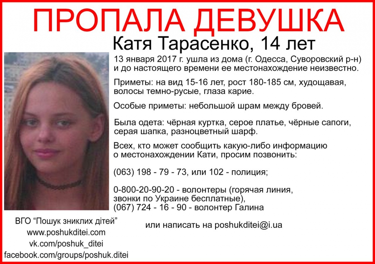 В Одессе полиция и волонтеры ищут 14-летнюю Катю Тарасенко, которая 13 января ушла из дома в Суворовском районе Одессы и до сих пор не вернулась. Приметы: на вид 15-16 лет, рост 180-185 см, худощавая, волосы темно-русые, глаза карие. Особые приметы: небольшой шрам между бровей. Была одета в черную куртку, серое платье, черные сапоги, серую шапку, разноцветный шарф. СМЕРТЬ РОСІЙСЬКИМ ОКУПАНТАМ! Помітили помилку? Виділяйте слова з помилкою та натискайте control-enter |