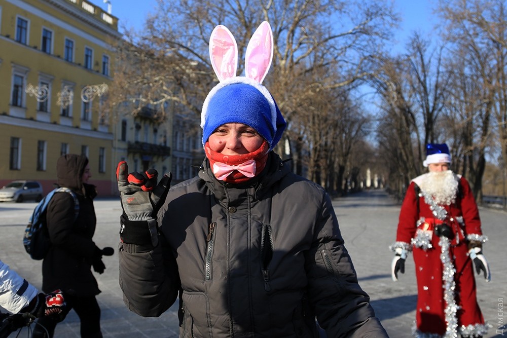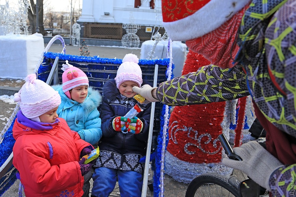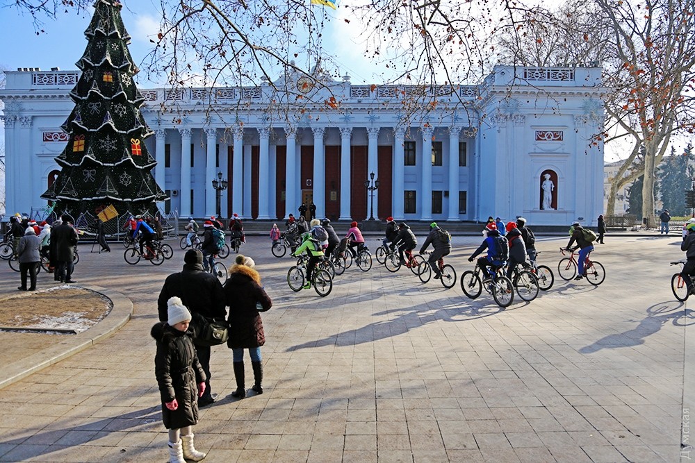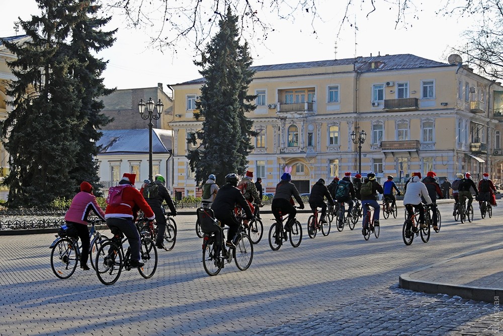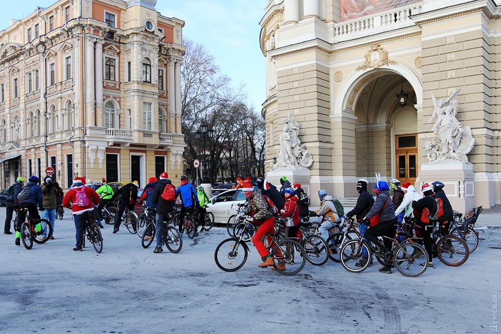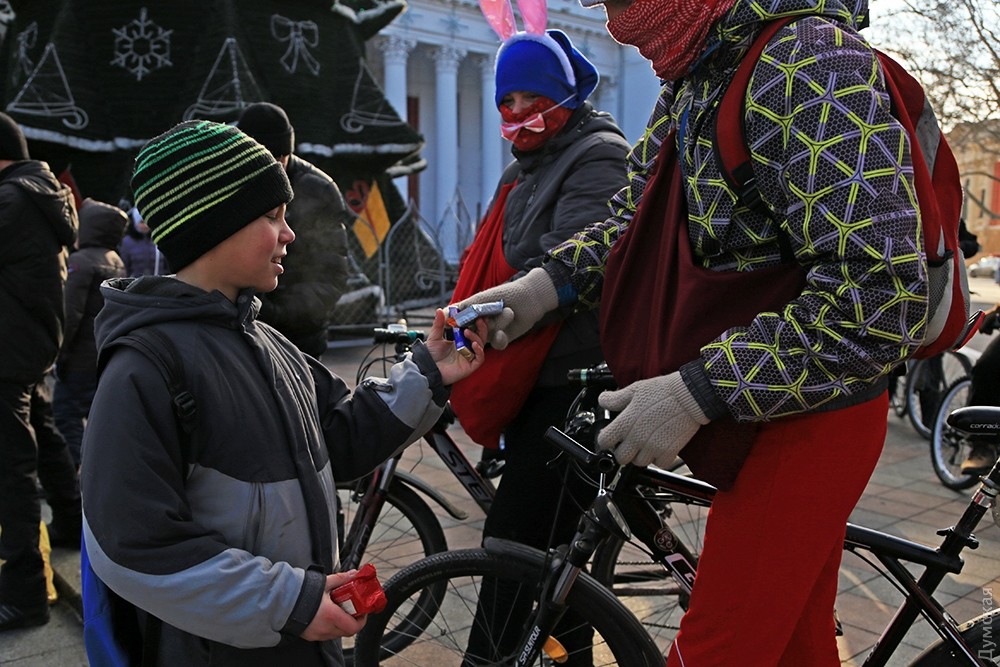 Вслед за бегунами, стартовавшими 1 января, сегодняшнее морозное утро отметилось велопробегом санта-морозов и других сказочных персонажей. Не все заявленные участники смогли преодолеть искушение не покидать квартиры, ведь в некоторых районах города мороз достигал минус 15, но благая цель акции заставила самых ответственных таки расстаться с теплым уютом и поучаствовать в раздаче новогодних и рождественских подарков детям на улицах Одессы.