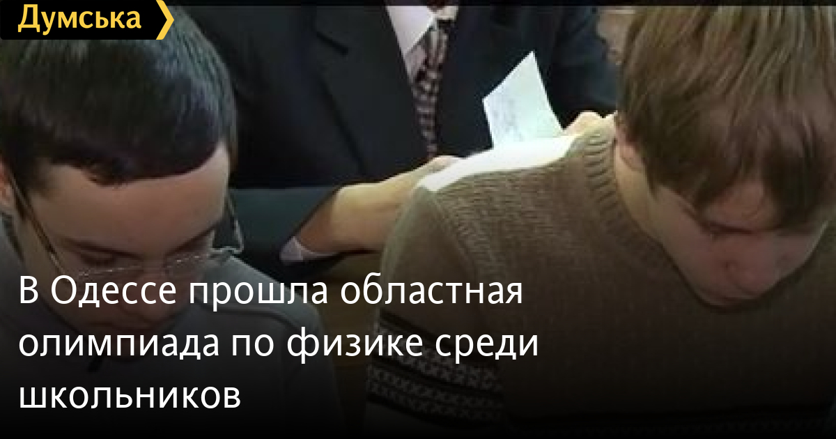 Паскаль, Ньютон, Эйнштейн уступают место молодым. Более 100юных физиков со всего региона собрались посоревноваться в решении задач. С 15 января по 21 февраля в Одессе пройдет третий областной этап Всеукраинских ученических олимпиад. СМЕРТЬ РОССИЙСКИМ ОККУПАНТАМ! Заметили ошибку? Выделяйте слова с ошибкой и нажимайте control-enter Думская ТВ. Сюжеты: