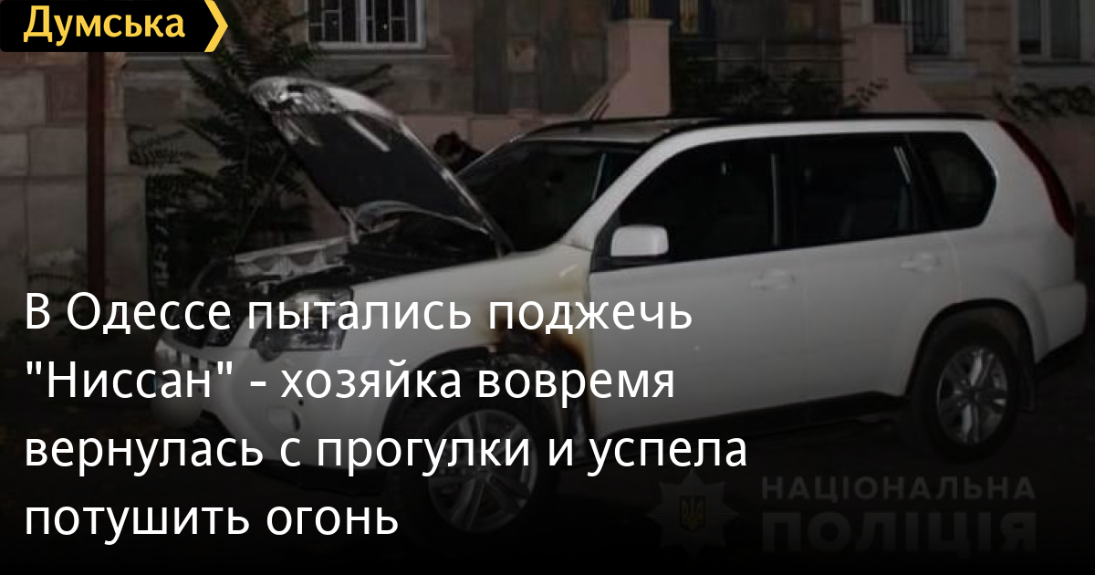 В Одессе пытались поджечь «Ниссан» — хозяйка вовремя вернулась с прогулки и успела потушить огоньАвтомобиль «Ниссан» пытались сжечь во дворе дома в переулке Маяковского в Одессе. Об этом сообщает пресс-служба областного управления Национальной полиции. Пламя погасила хозяйка машины, которая как раз в это время вернулись с прогулки. Она сообщила об инциденте полиции, и вскоре правоохранители задержали подозреваемого. Ему объявили о подозрении по ч.2 ст.194 Уголовного кодекса Украины (умышленное уничтожение или повреждение имущества). Фигуранту грозит от трех до десяти лет тюрьмы. СМЕРТЬ РОСІЙСЬКИМ ОКУПАНТАМ! Помітили помилку? Виділяйте слова з помилкою та натискайте control-enter |
