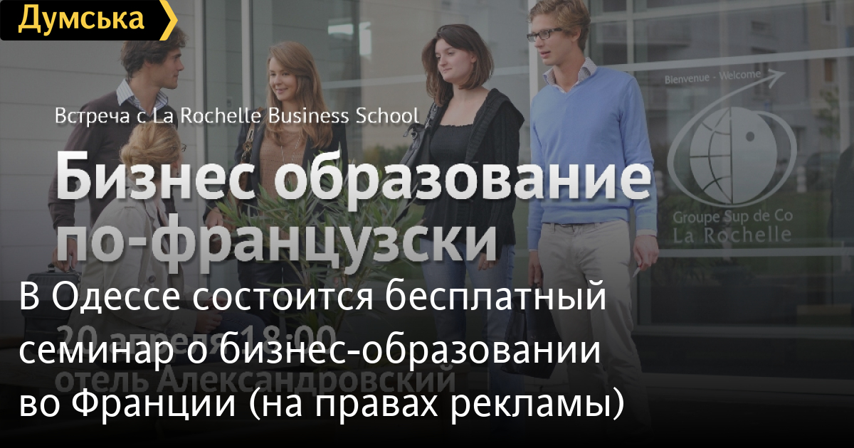 В Одессе состоится бесплатный семинар о бизнес-образовании во Франции (на правах рекламы)20 апреля в Одессе состоится бесплатный семинар о бизнес-образовании во Франции. Семинар пройдет в отеле «Александровский» и станет полезным для тех, кто планирует получить МВА или степень магистра в Европе, а также для тех, кто подбирает для своего ребенка качественное образование в сфере менеджмента и бизнеса за рубежом. Спикерами мероприятия станут представители французской бизнес-школы La Rochelle, которая входит в 5% лучших бизнес заведений в мире. Для участия в семинаре нужно пройти короткую регистрацию. Семинар и консультация после него поможет вам: - выбрать специальность, востребованную для европейского рынка - ознакомиться с программой Master in Management, на которую можно поступить с любым дипломом бакалавра - узнать о программах 2-го диплома для бакалавра школы La Rochelle - понять французскую систему образования и условия поступления. La Rochelle – рейтинговая бизнес-школа Франции, 90% выпускников которой получают предложение о работе сразу после выпуска. Программа образования построена таким образом, чтобы студент каждый год проходил стажировку в ведущих компаниях Франции или других стран Европы, получая рекомендательные письма и опыт работы в европейской компании. Бизнес-школа La Rochelle состоит в французской ассоциации элитных вузов Conférence des Grandes Ecoles. Семинар состоится 20 апреля в 18:00 в отеле «Александровский» по адресу пр-т Александровский, 12. Для участия в семинаре нужно пройти короткую регистрацию. Контактная информация: +38 (048) 789-09-35, +38 (067) 957-49-22 СМЕРТЬ РОССИЙСКИМ ОККУПАНТАМ! Заметили ошибку? Выделяйте слова с ошибкой и нажимайте control-enter |