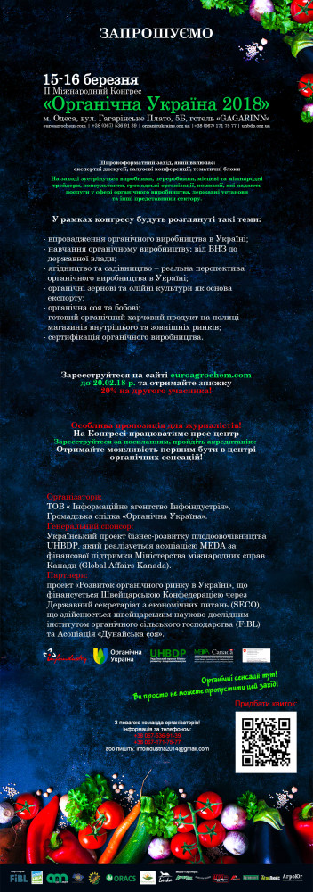 В Одессе состоится международный конгресс на тему органического производства в Украине (на правах рекламы)15 и 16 марта в Одессе состоится международный конгресс «Органическая Украина-2018» — широкоформатное мероприятие, которое включает экспертные дискуссии, отраслевые конференции, тематические блоки. В рамках конгресса запланированы встречи производителей, переработчиков, местных и международных трейдеров, консультантов, общественных организаций, компаний, предоставляющих услуги в сфере органического производства, государственных учреждений и других представителей отрасли. На форуме рассмотрят следующие темы: - внедрение органического производства в Украине, - обучение органическому производству, - плодоводство и садоводство — реальная перспектива органического производства в Украине, - органические зерновые и масличные культуры как основа экспорта, - органическая соя и бобовые, - готовый органический пищевой продукт на полках магазинов внутренних и внешних рынков, сертификация органического производства. Чтобы попасть на мероприятие, необходимо зарегистрироваться на сайте euroagrochem.com и получить скидку 20% на второго участника. Особое предложение для журналистов — на конгрессе будет работать пресс-центр. Зарегистрироваться можно по ссылке и получить аккредитацию. Организаторы: ООО «Информационное агентство Инфоиндустрия», общественный союз «Органическая Украина». Генеральный спонсор — украинский проект бизнес-развития плодоовощеводства UHBDP, который реализуется ассоциацией MEDA при финансовой поддержке министерства международных дел Канады (Global Affairs Kanada). Партнеры: проект «Развитие органического рынка в Украине», финансируемого Швейцарской Конфедерацией через Государственный секретариат по экономическим вопросам (SECO), осуществляемой швейцарским научно-исследовательским институтом органического сельского хозяйства (FiBL) и Ассоциация «Дунайская соя». Дополнительная информация по телефону: +38 067-536-91-39 + 38 067-171-75-77 или пишите на адрес infoindustria2014@gmail.com. СМЕРТЬ РОСІЙСЬКИМ ОКУПАНТАМ! Помітили помилку? Виділяйте слова з помилкою та натискайте control-enter |