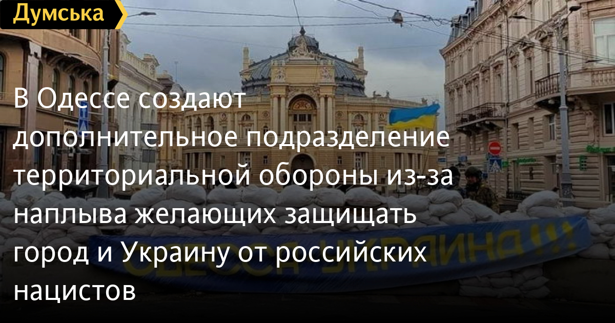 В Одессе создают дополнительное подразделение территориальной обороны из-за наплыва желающих защищать город и Украину от российских нацистовВ Одессе создают дополнительное подразделение территориальной обороны. Соответствующее решение принято командованием из-за огромного количества волонтеров, которые желают защищать город и Украину, сообщил вице-мэр Олег Брындак. «Сейчас городской оперативный штаб занимается его комплектацией, размещением и обеспечением. Одессу отстоим! Одесса – это Украина! Мы победим!» — сказал вице-мэр. СМЕРТЬ РОСІЙСЬКИМ ОКУПАНТАМ! Помітили помилку? Виділяйте слова з помилкою та натискайте control-enter |