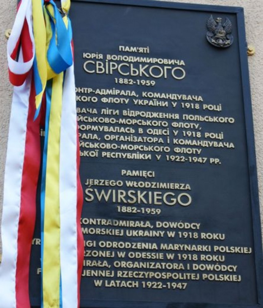 На фасаде здания штаба Одесского отряда морской охраны, что на Приморской улице, установили мемориальную доску знаменитому контр-адмиралу Юрию Свирскому. Как сообщает пресс-служба горсовета, Генеральное консульство Республики Польша в Одессе обратилось в историко-топонимическую комиссию с просьбой об установлении мемориальной доски контр-адмиралу, командующему Морского флота независимой Украины в 1918 году, вице-адмиралу Польской Республики Юрию Владимировичу Свирскому еще несколько лет назад. «После детального рассмотрения всех представленных материалов историко-топонимической комиссией было принято решение о целесообразности установки мемориальной доски», — говорится в сообщении. На торжественном открытии звучали государственные гимны Украины и Польши, а на самой памятной доске размещены символы польского и украинского флотов. В ходе церемонии представители польской стороны рассказали о роли адмирала Юрия Свирского в становлении украинского и польского флотов, его заслугах перед Украиной и Польшей, выразили благодарность за возможность увековечить память выдающегося поляка. «Юрий Свирский – личность, которая объединяет два народа. Открытие мемориальной доски в его честь является свидетельством нашей общей истории, а также свидетельством того, что мы не забываем о людях, которые не боялись противостоять самым сложным вызовам. О таких личностях стоит помнить, особенно сейчас», — отметил начальник Управления по делам ветеранов и репрессированных лиц Республики Польша, министр Ян Чехановски. В завершение мероприятия присутствующие возложили цветы к мемориальной доске.