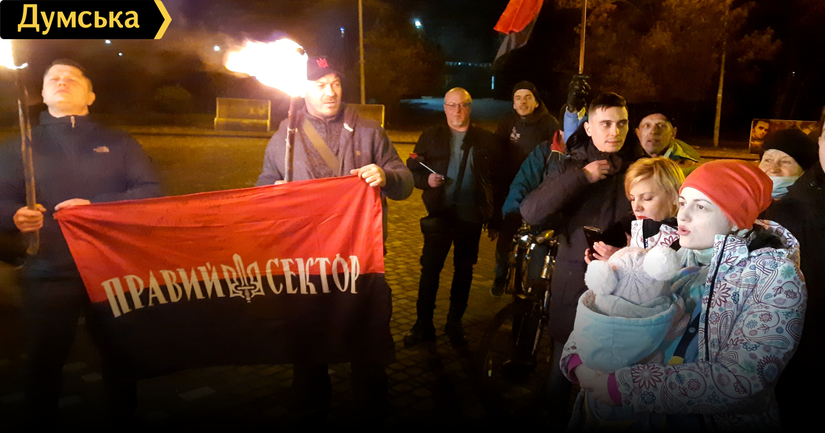 Как сообщает корреспондент «Думской», участники акции зажгли факелы и спели марш Украинской повстанческой армии.