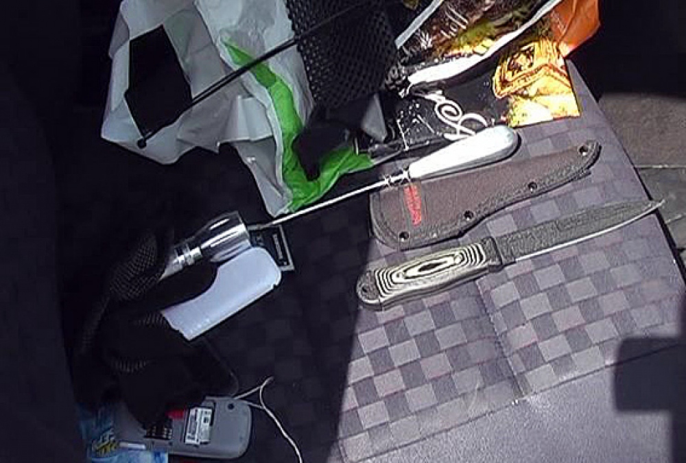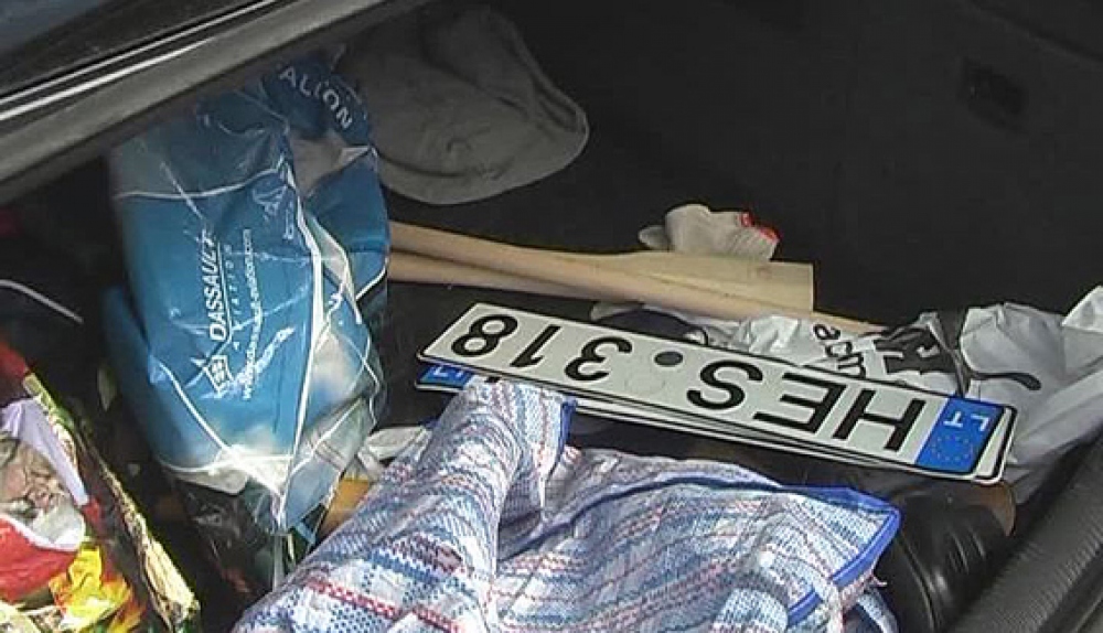 При осмотре салона и багажника правоохранители нашли номерные знаки, зарегистрированные в Литве, нож, кирпич, биту, две балаклавы, две пары перчаток и бинокль.