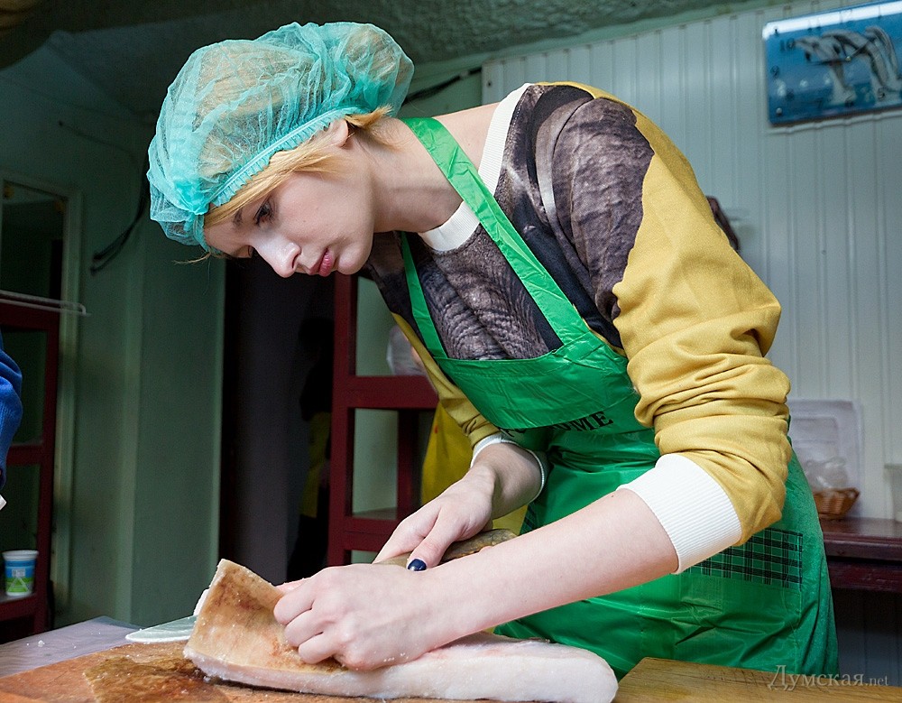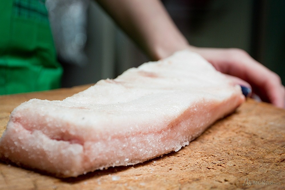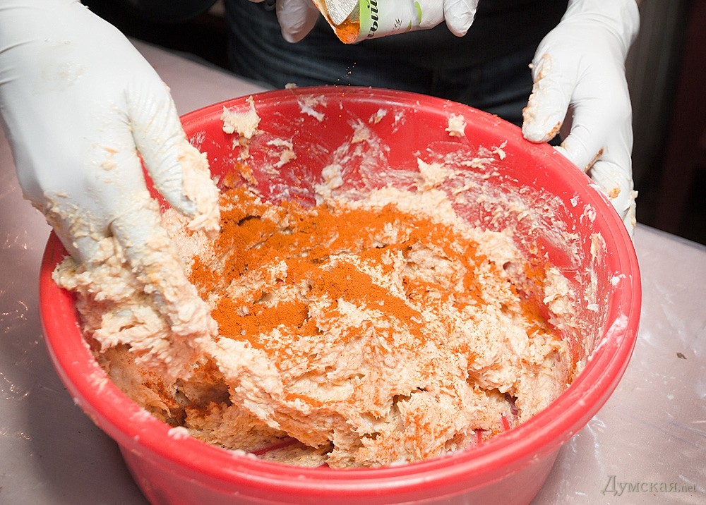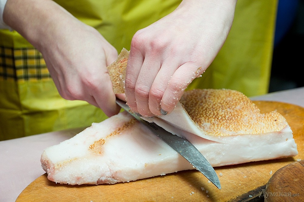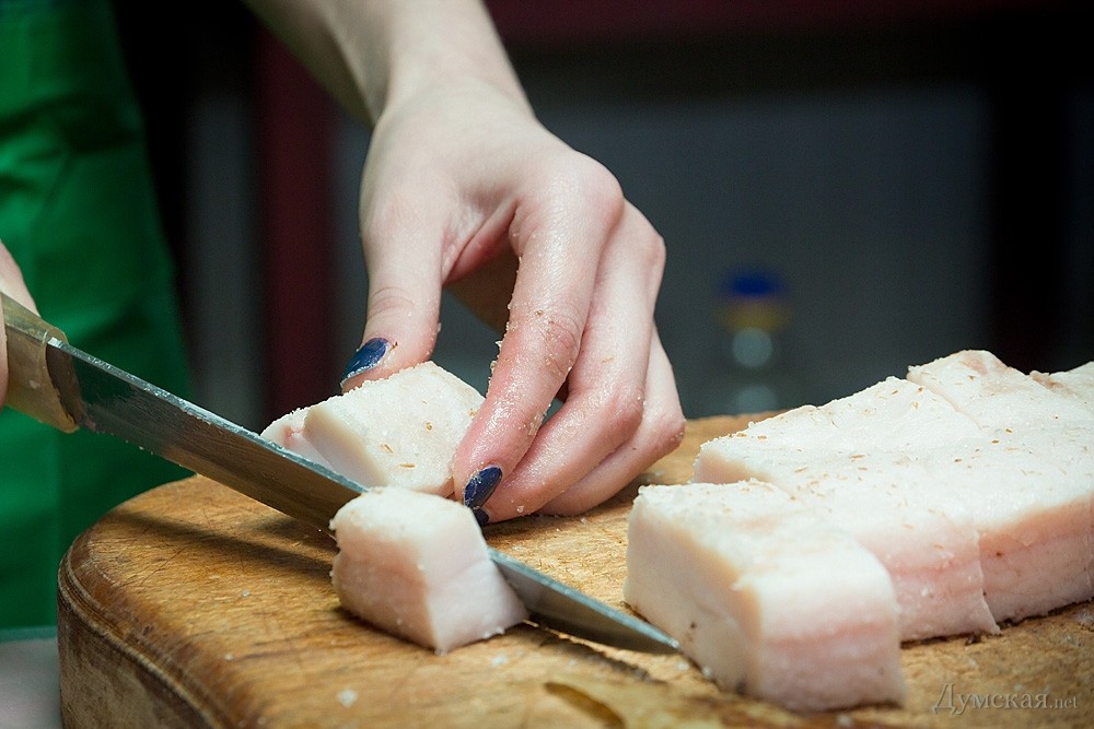 Надев фартуки и обязательные поварские шапочки, редакторы, репортеры, операторы, фотографы и волонтеры приступают к приготовлению национального блюда. Рецепт прост. Сало бережно отделяют от шкурки, режут на небольшие кубики и пропускают через мясорубку. Потом туда же отправляют чеснок. Получившийся фарш тщательно перемешивают, щедро приправляют красным перцем и раскладывают в небольшие контейнеры.