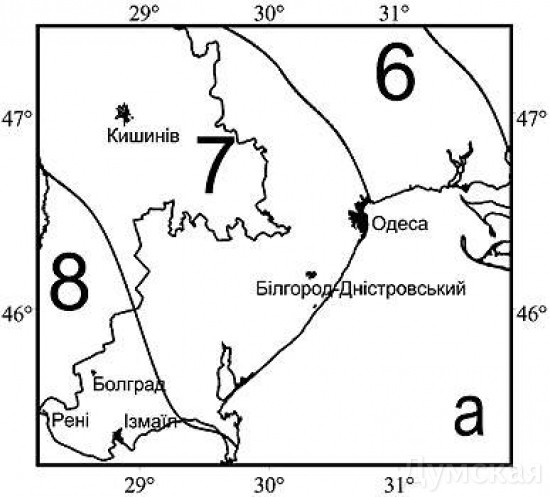 Для справки: как полагают специалисты, землетрясения интенсивностью в 6 баллов происходят в Одессе раз в 700-800 лет, для интенсивности 7 баллов этот период равен 1115 лет, а раз в 3825 лет в Одессе возможны сотрясения до 8 баллов. Однако приведенные сроки совсем не означают, что восьмибалльное землетрясение произойдет обязательно через четыре тысячелетия. Оно может случиться и завтра, и через 5-6 тысяч лет.