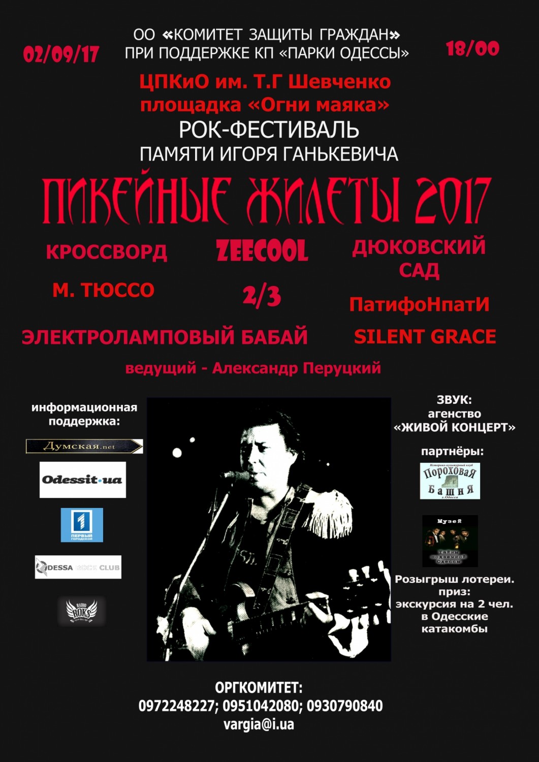2 сентября 2017 года на площадке «Огни маяка» (парк Шевченко) состоится фестиваль памяти известного одесского рок-музыканта, лидера группы «Бастион» Игоря Ганькевича «Пикейные жилеты».