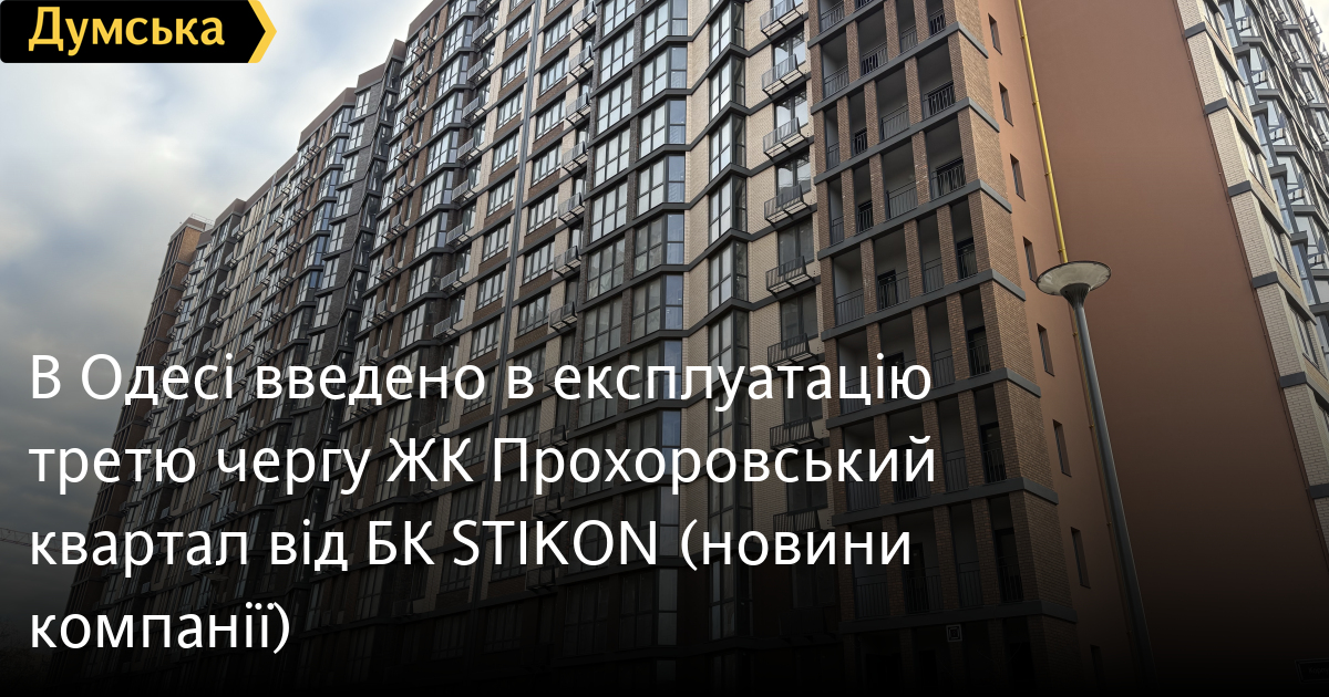 В Одесі введено в експлуатацію третю чергу ЖК «Прохоровський квартал» від БК STIKON (новини компанії)В умовах повномасштабної війни, коли будівельна галузь переживає непрості часи, одеська будівельна компанія «Стікон» продовжує виконувати взяті на себе зобов'язання перед інвесторами та послідовно здає житлові об'єкти в експлуатацію. Черговим підтвердженням цієї роботи стало введення в експлуатацію третьої черги житлового комплексу «Прохоровський квартал». Новий етап проєкту – це близько 43 тисячі квадратних метрів житла і понад 500 квартир, які вже найближчим часом зможуть прийняти своїх власників. «Прохоровський квартал» – один із масштабних житлових проєктів СК «Стікон» у центральній частині Одеси, що поєднує сучасну архітектуру, продумані планування та розвинену внутрішню інфраструктуру. Реалізація третьої черги стала важливим кроком як самого проєкту, так і ринку первинної нерухомості міста загалом. Раніше «Думська» вже повідомляла, що «Стікон» не тільки завершує поточні об'єкти, а й запускає нові етапи будівництва. Зокрема, компанія розпочала зведення та відкрила продажі нових черг у ЖК «Прохоровський квартал» та ЖК Real Park, що свідчить про довгострокові плани та впевненість забудовника в майбутньому. Введення будинків в експлуатацію за нинішніх умов — це не лише виконання контрактних зобов'язань, а й внесок в економічну стійкість міста, збереження робочих місць та підтримку суміжних галузей. Редакція бажає будівельній компанії «Стікон» успішної реалізації нових проєктів, стабільної роботи та подальших досягнень у 2026 році, а одеситам — якнайбільше хороших новин та приводів для впевненості у завтрашньому дні. СМЕРТЬ РОСІЙСЬКИМ ОКУПАНТАМ! Помітили помилку? Виділяйте слова з помилкою та натискайте control-enter |