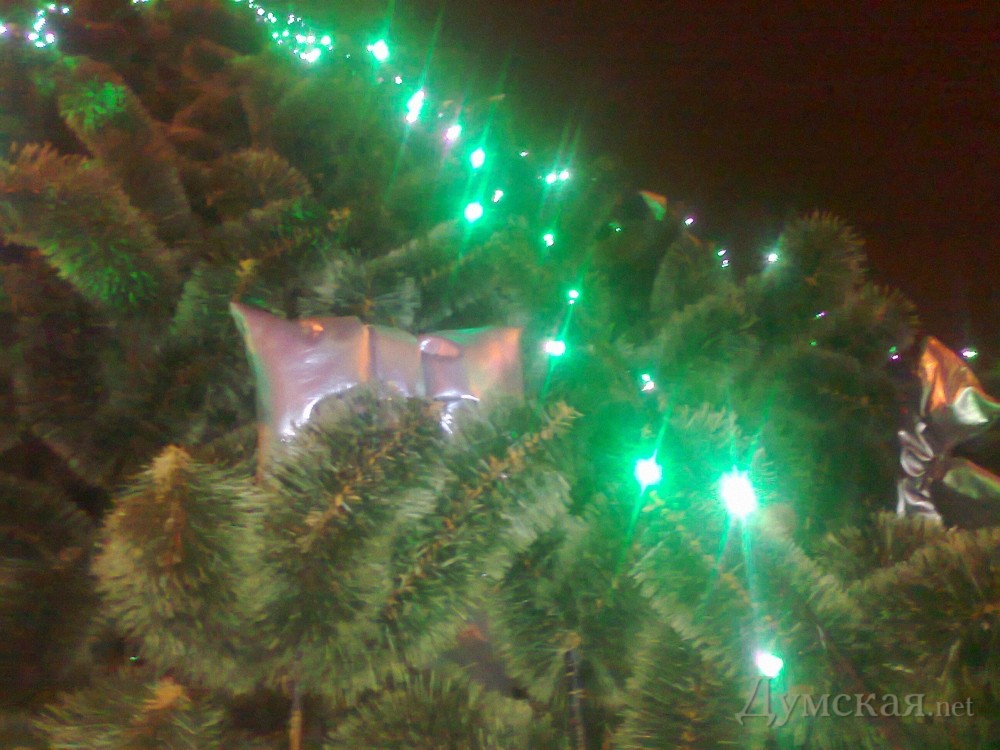 Елка украшена светодиодными гирляндами, синими звездами и серебряными бантами. Ее огни зажглись в 21:00 1 декабря в присутствии главы Киевской райадминистрации Владимира Сушкова.Таким образом, открылась первая в городе официальная елка.