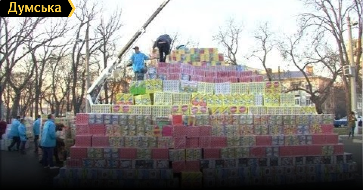 Одесские волонтёры установили самую большую пирамиду из 111 тысяч детских игрушек. Конструкцию складывали больше 5 часов. Все подарки развезут детям в приюты и интернаты со всей страны.