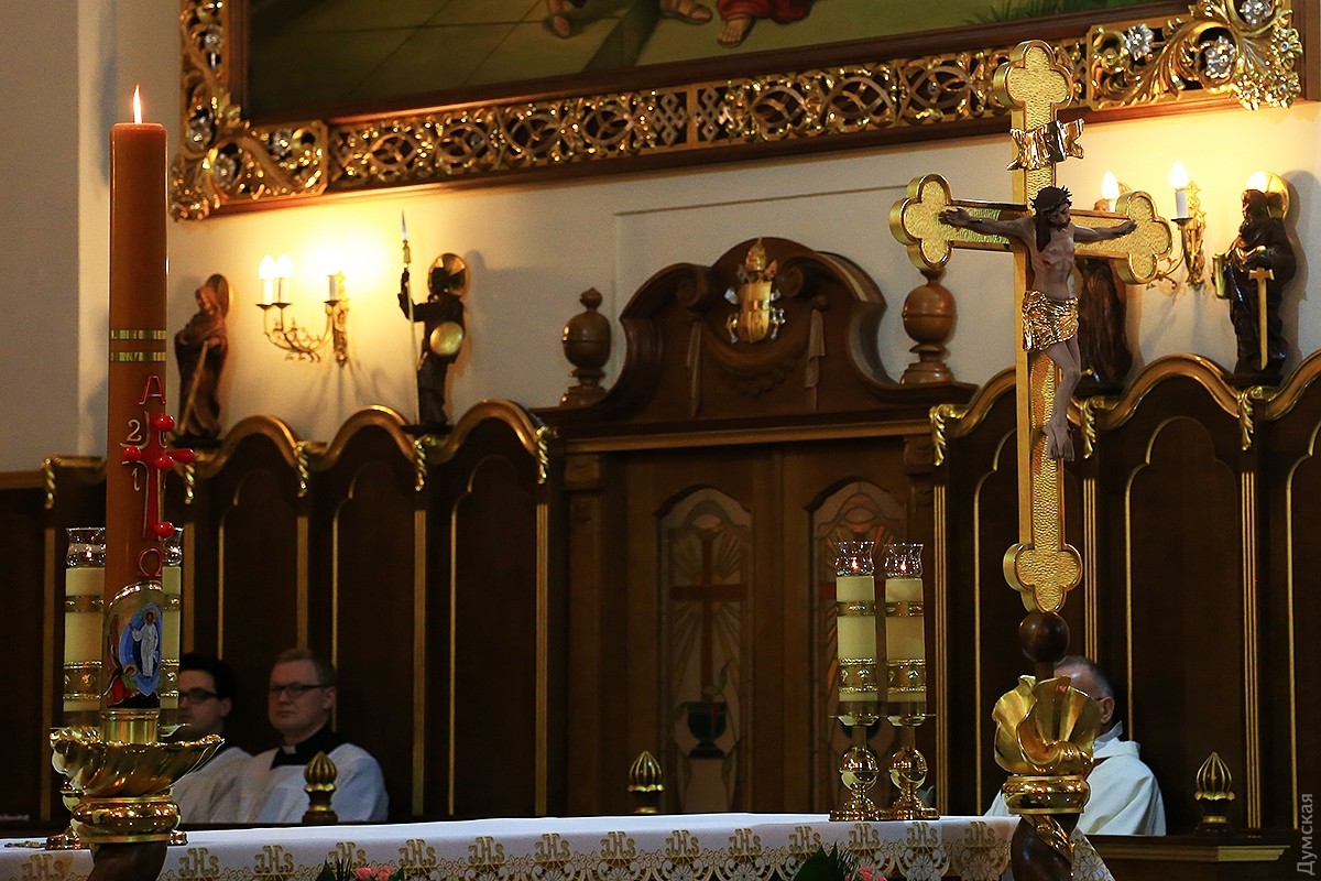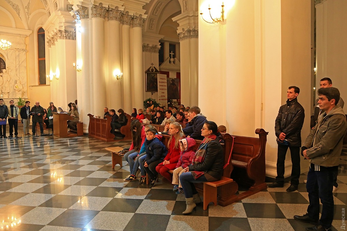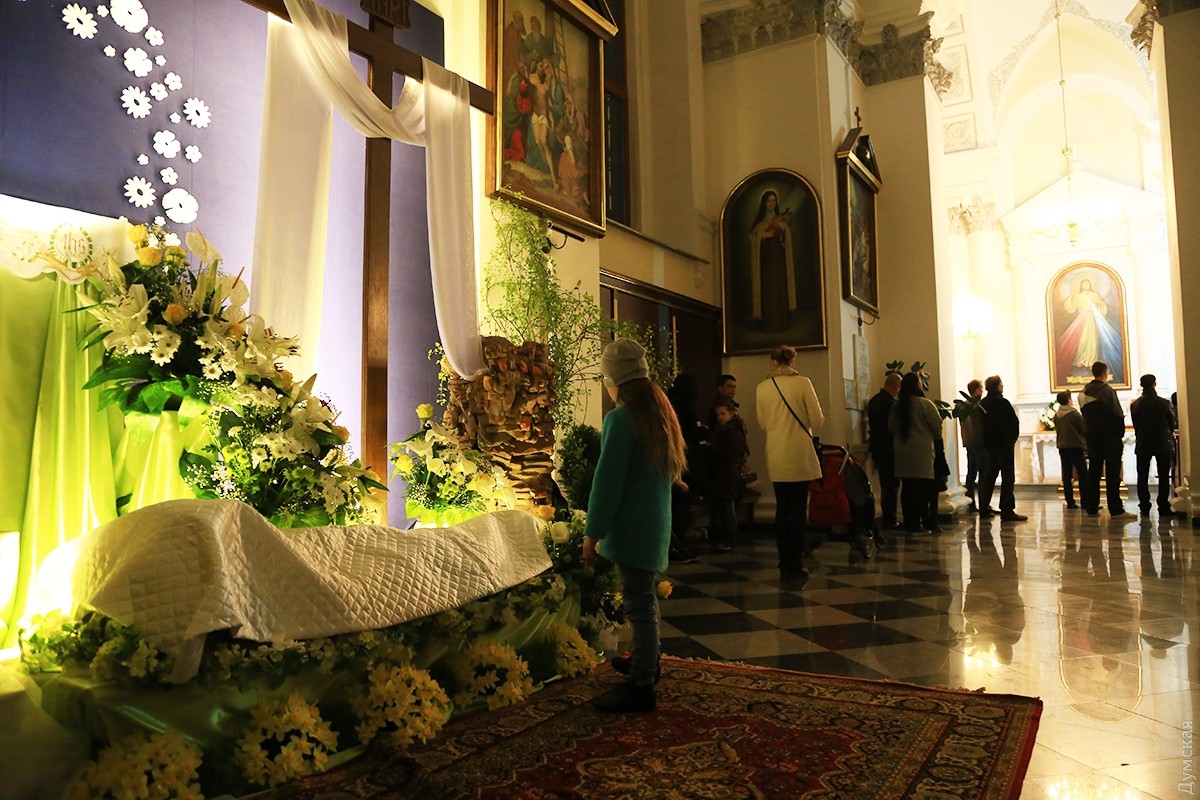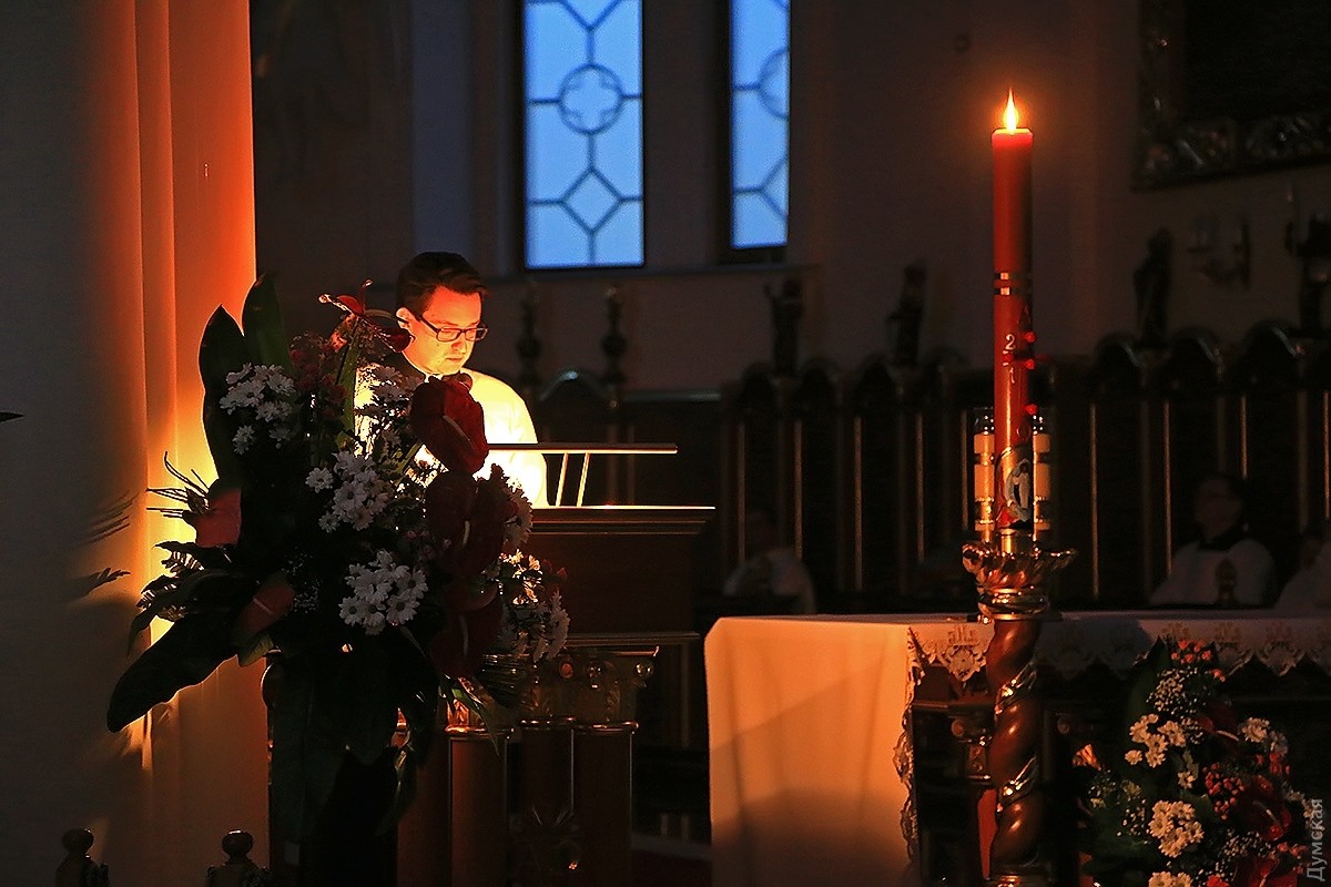 В одесских христианских храмах проходят ночные пасхальные службы. В римско-католическом соборе Успения Пресвятой Девы Марии праздничное действо началось в 19 часов. Несмотря на большое количество скамеек, к 21:00 в храме не было свободных мест, и многие прихожане стояли в проходах, наблюдая и слушая службу. Месса пасхальной ночи у католиков состоит из следующих частей: литургия света, литургия слова, крещальная литургия и евхаристическая литургия. В эту ночь принято совершать крещение, миропомазание и первое причастие взрослых, которые хотят присоединиться к Церкви. Фото Сергея Смоленцева СМЕРТЬ РОСІЙСЬКИМ ОКУПАНТАМ! Помітили помилку? Виділяйте слова з помилкою та натискайте control-enter Новини по цій темі: 16 квітня 2023: Одесити справляють Воскресіння Христове: біля храмів Православної церкви України величезна кількість вірян (фоторепортаж) 20 квітня 2022: В Украине из-за военного положения не будет дополнительных выходных на Пасху и майские 4 травня 2021: В Турции закрыли гостиницу из-за вечеринки с туристами без масок – в числе нарушителей были украинцы 2 травня 2021: Одесские православные, греко-католики и часть протестантов отмечают Воскресение Христово (фоторепортаж) |