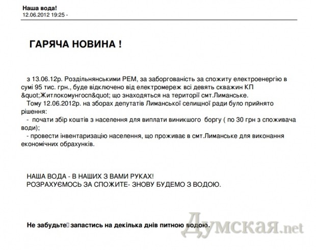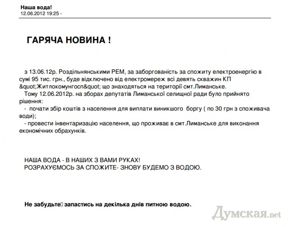 В Одесской области коммунальщики погасили свой долг, собрав с людей по тридцаткеЛюбопытное ноу-хау придумали сотрудники коммунального предприятия «Лиманскоетеплокоммунэнерго», чтобы возобновить работу питающих поселок Лиманское Раздельнянского района Одесской области артезианских скважин. Как передает корреспондент «Думской», скважины отключило на днях за неуплату облэнерго. Население при этом рассчитывается за воду исправно, и откуда долг за электричество, понятно не очень. Какой же выход из ситуации предложили коммунальщики? Нет, не повысить эффективность своей работы, разобравшись с казнокрадами и бракоделами, а в очередной раз переложить проблему на плечи рядовых потребителей. От граждан потребовали скинуться по 30 грн – вне зависимости от того, кто как платит за услуги водоснабжения. Иначе, мол, все останутся без воды и засохнут. Автор — Виктор Босняк СМЕРТЬ РОСІЙСЬКИМ ОКУПАНТАМ! Помітили помилку? Виділяйте слова з помилкою та натискайте control-enter |