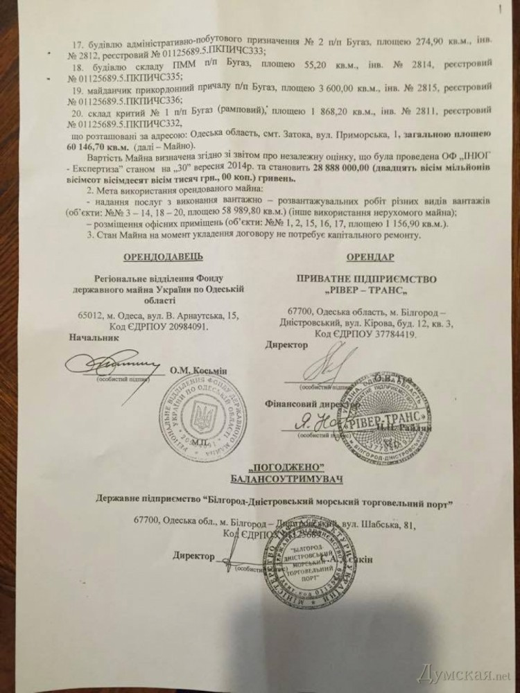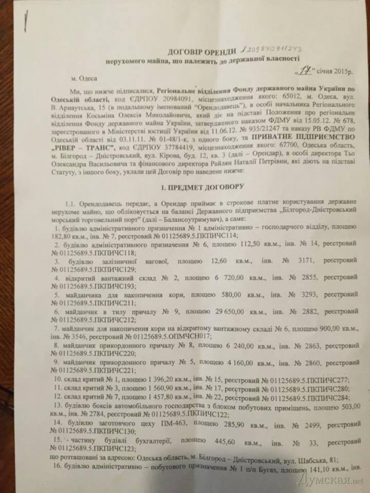 В Одесской области часть порта сдали в аренду сомнительной фирме по заниженной стоимости (документ, обновлено)Самые коммерчески привлекательные объекты Белгород-днестровского морского торгового порта, специализирующегося на перевалке леса, сданы в аренду сомнительной фирме. Об этом свидетельствует договор аренды, копией которого располагает «Думская». Арендатор — ЧП «Ривер-Транс». Уставный капитал фирмы — 2050 гривен. Учредитель и директор фирмы — 28-летний Тьо Александр Васильевич, который, если верить популярному сайту по трудоустройству, еще три года назад был безработным. Сомнительной выглядит и указанная в договоре стоимость передаваемого имущества — причалы, склады, админздания и прочие объекты площадью больше 60 тыс. кв.м. оценили в смехотворные 29 млн гривен. Работники порта рассказали «Думской», что примерно половину трудового коллектива порта — а это 440 человек, включая 200 докеров — сейчас заставляют подписать контракты с арендатором: «Тех, кто откажется, обещают уволить. Думать дали до 16 февраля. Тут очень важным момент: первоначально эти мощности должны были передать в концессию, что означает сохранение за работниками государственного соцпакета. В результате передали в краткосрочную аренду на 2 года. Это значит, что никаких социальных благ не будет», — отметил наш собеседник. ОБНОВЛЕНО В 17:39. Глава одесского представительства Фонда Госимущества Алексей Косьмин заявил «Думской», что мы обнародовали неполный документ: «У вас опубликована первая страница договора и последняя — акта приема-передачи, поэтому оно так странно и выглядит. Сам договор многостраничный, там присутствует все, что должно быть. Что касается самой передачи в аренду, то ее целесообразность определяет организация, которая управляет портами — Министерство инфраструктуры. Мы здесь выступаем просто как арендодатель. Если есть одна заявка от желающего взять имущество в аренду, то оно сдается автоматически ему, если таких заявок несколько — проводится конкурс. Решает это комиссия местного представительства ФГИУ». Косьмин также сообщил, что, кроме портопункта «Бугаз» (пгт Затока), о котором идет речь в этой заметке, в аренду было передано и недвижимое имущество, расположенное на основной территории порта. Его площадь — 223 тыс. кв.м., оценочная стоимость — 14 млн. грн. Он затруднился назвать ставку арендной платы по обоим объектам, предложив направить информационный запрос. СМЕРТЬ РОСІЙСЬКИМ ОКУПАНТАМ! Помітили помилку? Виділяйте слова з помилкою та натискайте control-enter |