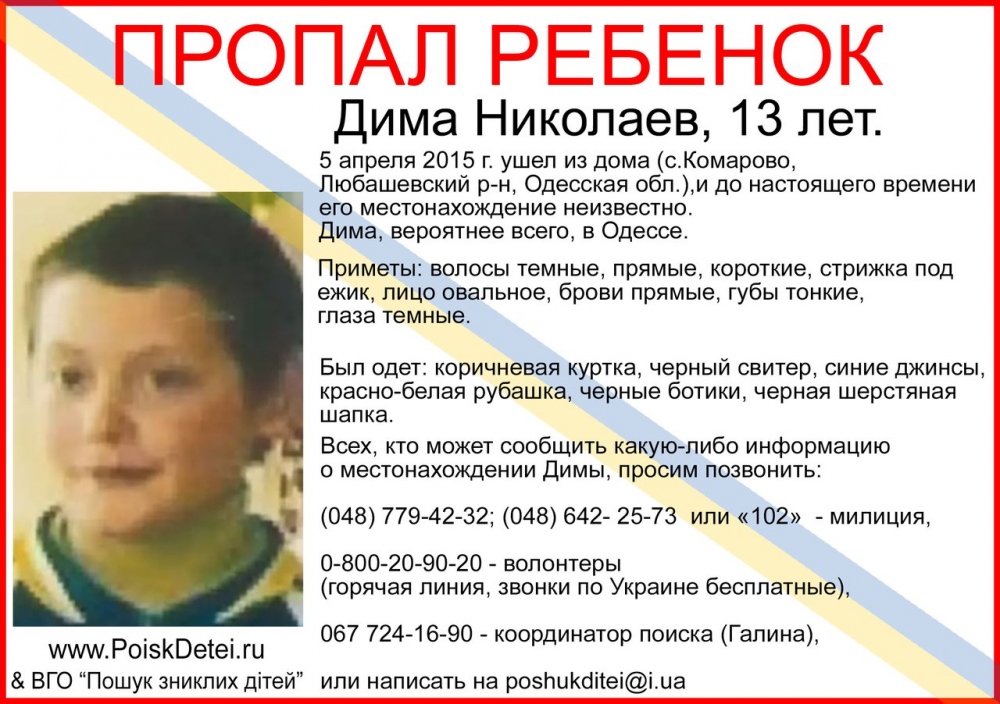 Милиция и волонтеры уже пятый день ищут 13-летнего Диму Николаева из села Комарово Любашевского района Одесской области.