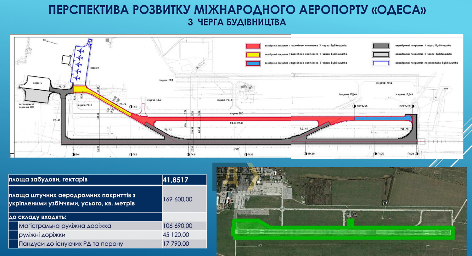 Стартовала третья очередь строительства и реконструкции воздушных ворот Одессы. Об этом сообщило Государственное агентство инфраструктурных проектов Украины. Третья очередь предусматривает сооружение новой магистральной рулежной дорожки (МРД). Пока что начаты предварительные работы — разметка и геодезические изыскания. Дорожку построят между старой и новой взлетно-посадочными полосами. Основной этап работ начнется после ввода в эксплуатацию новой полосы, который ожидается 15 июля. Технология будет точно такой же, как при строительстве новой полосы — подрядчику предстоит вырыть котлован рядом со старой ВПП , заполнив его несколькими слоями песка, щебня и бетона на глубину около метра. Первый пусковой комплекс отмечен на схеме красным цветом — это центральная часть МРД между скоростными рулежными дорожками РД-А2 и РД-А4. Второй пусковой комплекс — сооружение новой РД к старому и новому перрону (желтым цветом), третий — достройка МРД от РД-А4 до РД-А5 (синий цвет). Ширина новой магистральной рулежки — 30 метров, общая площадь бетонного покрытия третьей очереди — около 170 тысяч квадратных метров. На 2021-й предусмотрено выделение 703 миллионов гривен, которые пойдут на завершение второй очереди строительства и начало третьей очереди. Сметная стоимость третьей очереди — 932 миллиона 400 тысяч гривен, таким образом общая стоимость реконструкции одесского аэропорта приблизилась к 4 миллиардам. СМЕРТЬ РОСІЙСЬКИМ ОКУПАНТАМ! Помітили помилку? Виділяйте слова з помилкою та натискайте control-enter Новини по цій темі: 18 квітня 2024: Ексмер Одеси Олексій Костусєв ховається від слідства в елітному районі Лондона: стала відома його адреса 29 березня 2024: Справа про заволодіння аеропортом "Одеса": ексвіцемер Орловський відбувся умовним терміном 28 лютого 2024: Відкрити українське небо: чим Бориспіль відрізняється від Бен-Гуріона і що потрібно зробити для відновлення авіасполучення? 23 лютого 2024: Костусєв ховається у Лондоні: за крадіжку одеського аеропорту його судитимуть заочно 11 грудня 2023: Ексмера Одеси Костусєва заочно постановили ув`язнити в СІЗО |