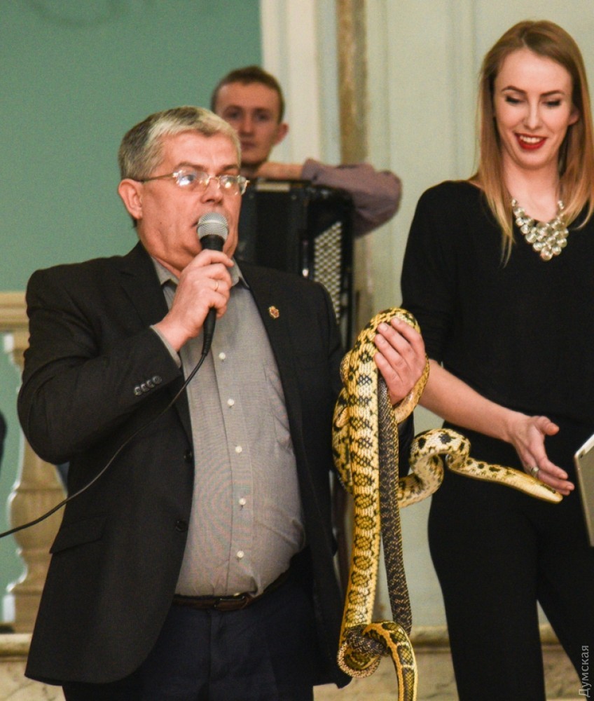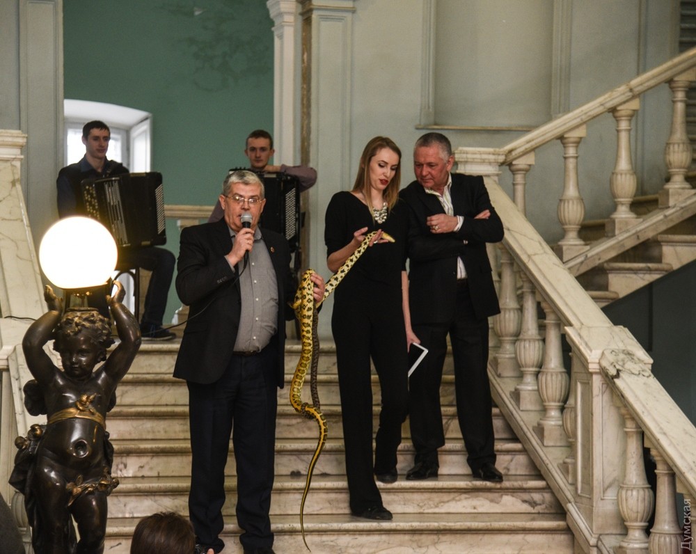 В честь этого устроили небольшое представление: среди гостей был директор одесского зоопарка Игорь Беляков, который пришел в музей с символом восточной мудрости в руках — со змеями.