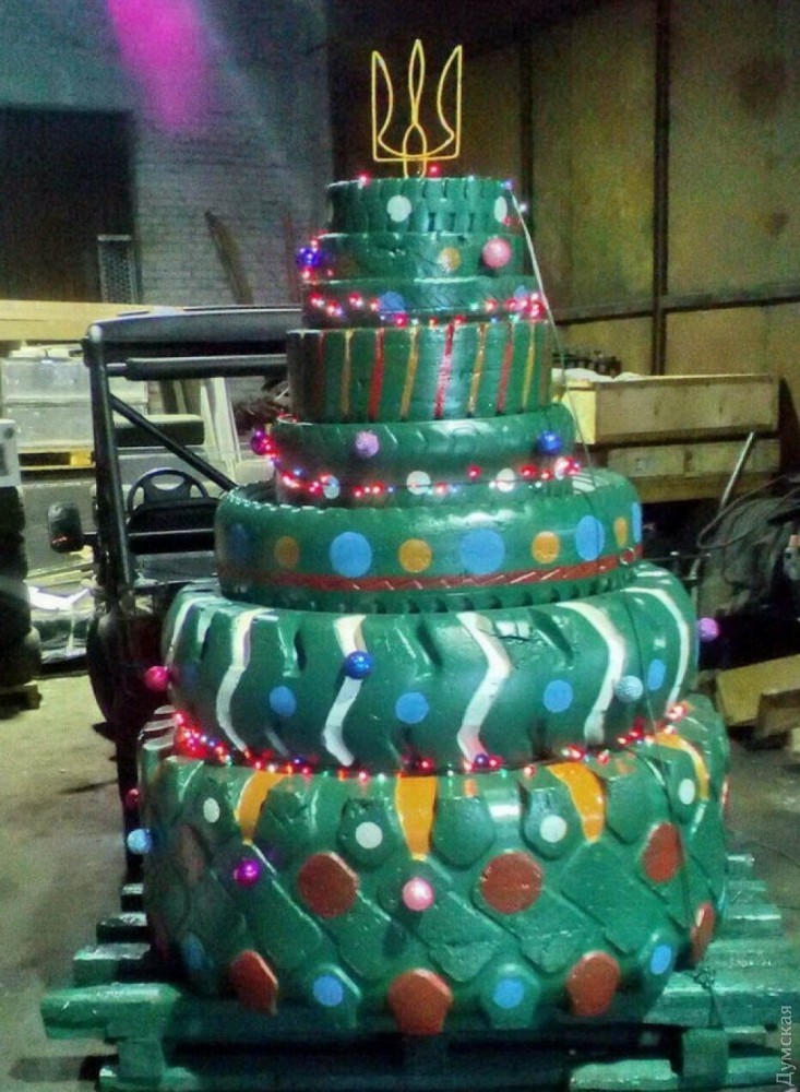 Работники Одесского морского порта собрали необычную новогоднюю елку из старых покрышек. Получилось очень даже ничего.