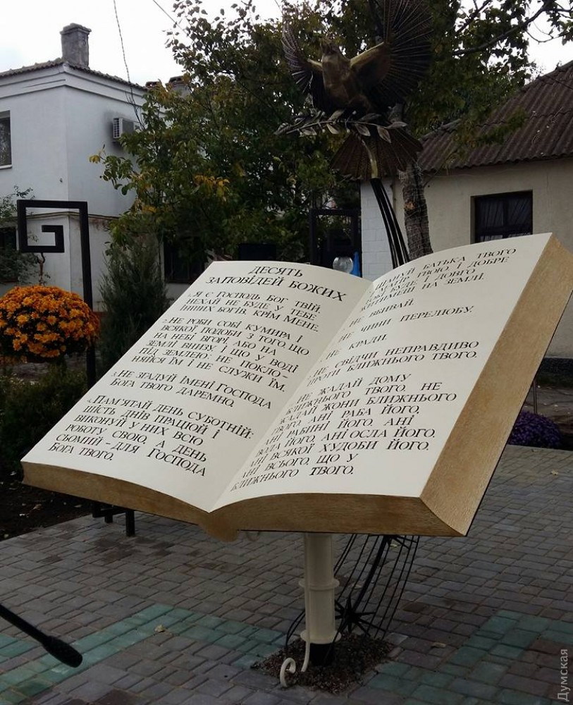Арт-объект «Десять заповедей» открыли сегодня в поселке Доброслав под Одессой. Памятник в виде раскрытой книги с текстом из Библии, над которым парит голубь, установлен в центре поселка, на Первомайской улице.