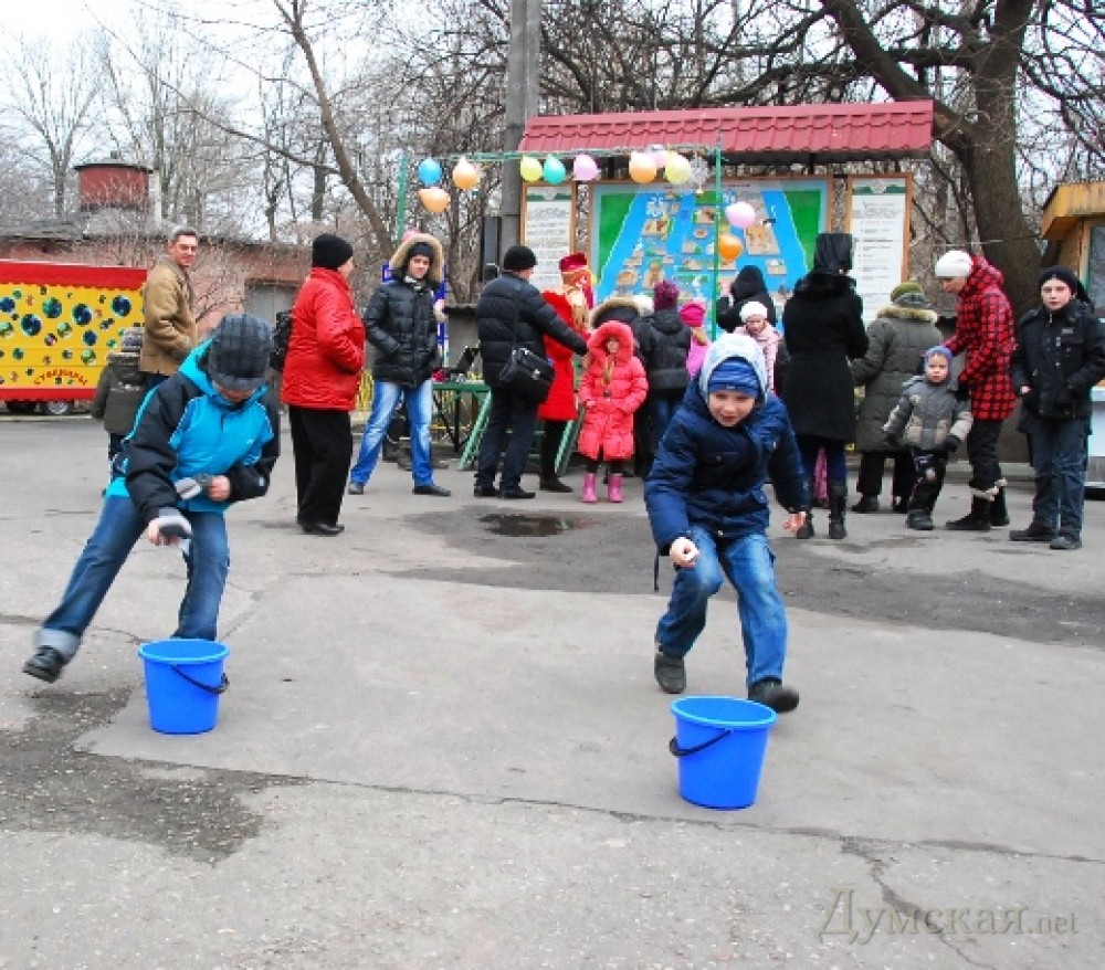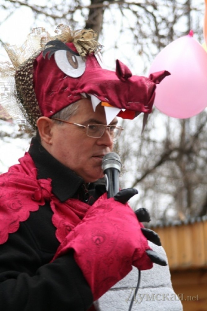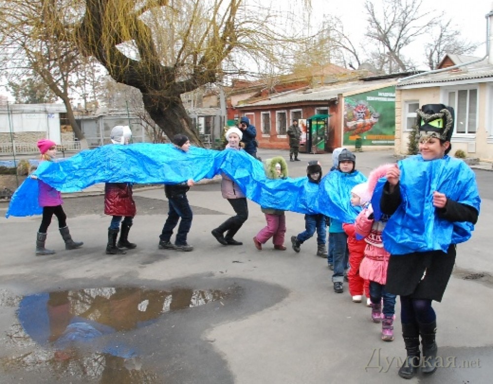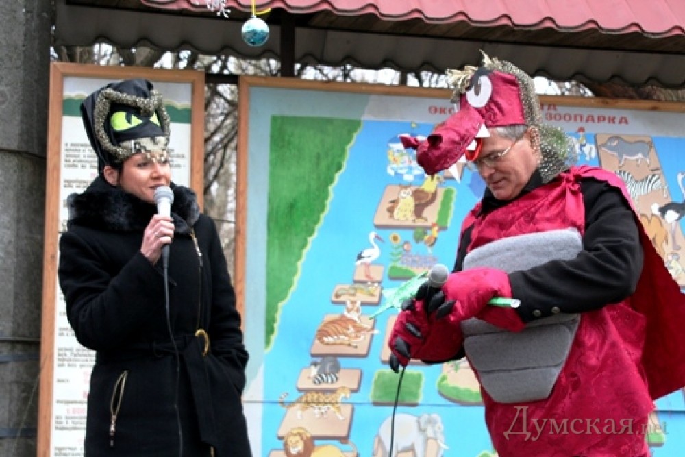 В минувшие выходные в одесском зоопарке прошел праздник проводов зимы. Центральными персонажами действа были Дракон и Змея – символы 2012 и 2013 года, сообщает пресс-служба горсовета. «Мы решили торжественно и официально провести зиму. Сотрудники зоопарка подготовили костюмы, придумали конкурсы, купили призы и подарки и даже сочинили песни. Правда, были сомнения, а придут ли посетители в зоопарк в ненастную последнюю субботу февраля, но мы решили не отступать и проводить праздник даже для одного посетителя. К счастью, несмотря на непогоду, к 12 часам на центральной площади зоопарка собрались и взрослые, и дети, — рассказал замдиректора зоопарка (он же Дракон) Игорь Беляков. — Главные сказочные герои праздника — Змея и Змей Горыныч, которому удалось убедить Крысу, Овцу, других животных, а также зрителей и участников, в том, что он Дракон. После чего состоялась передача посоха — символа власти в новом году Змее».