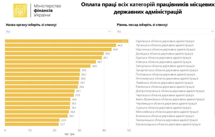 При цьому за кількістю співробітників наш регіон посідає друге місце в країні з показником 1378 осіб. Більше тільки в Дніпропетровській області — 1427 працівників. У Луганській і Херсонській ОВА по 631 працівнику, а в Донецькій ОВА - 1027 співробітників. Неабияк зросла заробітна плата у керівництва області за останній місяць. Якщо в січні вона в середньому становила 54 тис., то в лютому — вже понад 85 тис. гривень. Так само справи йдуть у керівників структурних підрозділів ОВА: у середньому за січень вони отримали 27 тис., а за лютий уже близько 60 тис. гривень. В аналогічній пропорції зросла заробітна плата і у фахівців — з 17,7 тис. до 32,5 тис. гривень. Примітно, що керівники структурних підрозділів райдержадміністрацій Одеської області в середньому отримують найбільше в країні — 36,3 тис. гривень. Фахівці в РДА опинилися на другому місці за зарплатами (23 тис. грн) після Київської області (23,8 тис. грн). Що стосується державних органів України, то, за даними Мінфіну, найбільше отримують співробітники Нацкомісії, що здійснює регулювання у сферах енергетики та комунальних послуг, — у середньому 90 тис. грн. Слідом ідуть працівники Нацагентства із запобігання корупції — 79,4 тис. грн, за ними Антимонопольного комітету — 77,4 тис. грн.