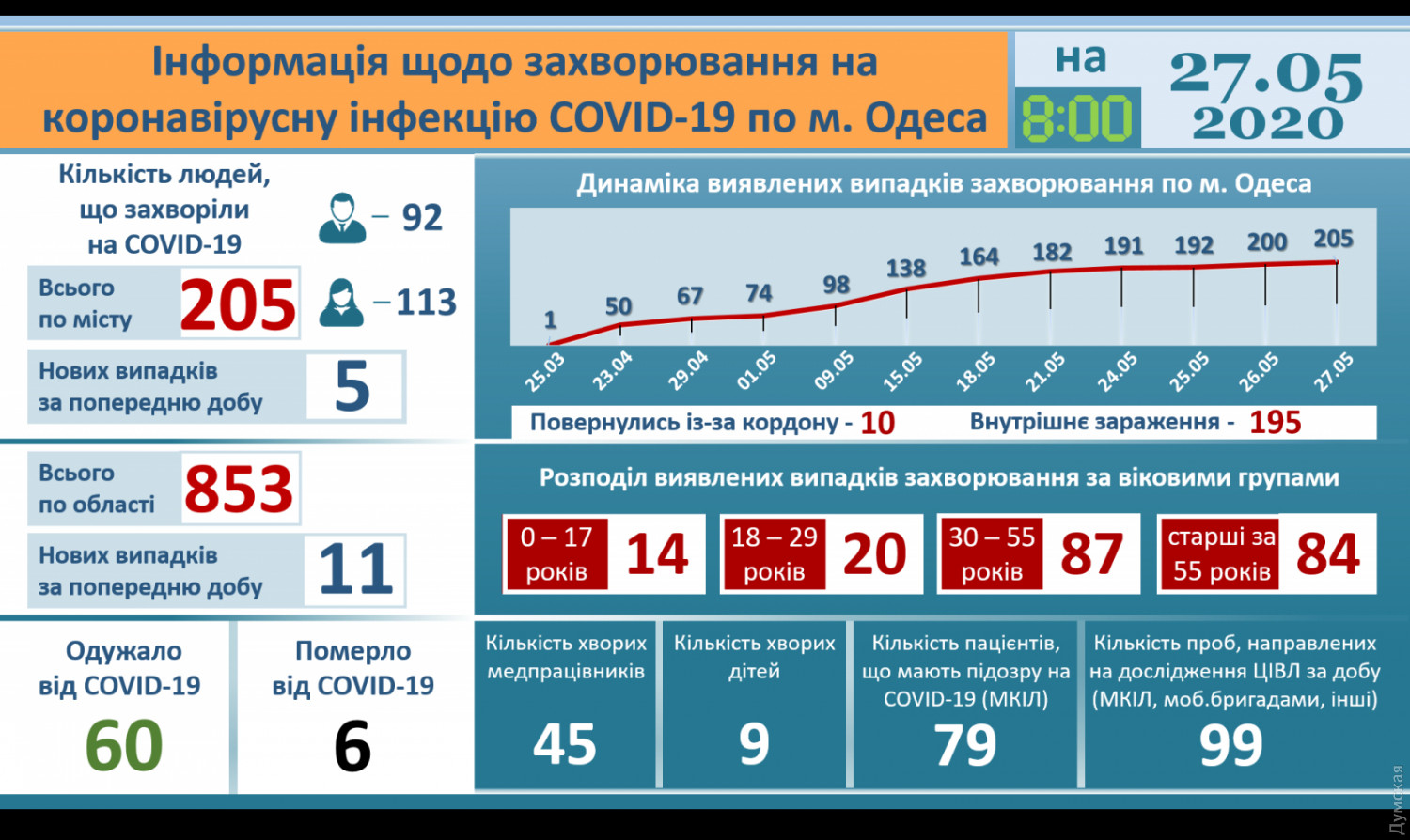 Таким образом, к настоящему времени в Одессе зарегистрированы 60 случаев выздоровления от COVID-19, продолжают болеть 139 одесситов.