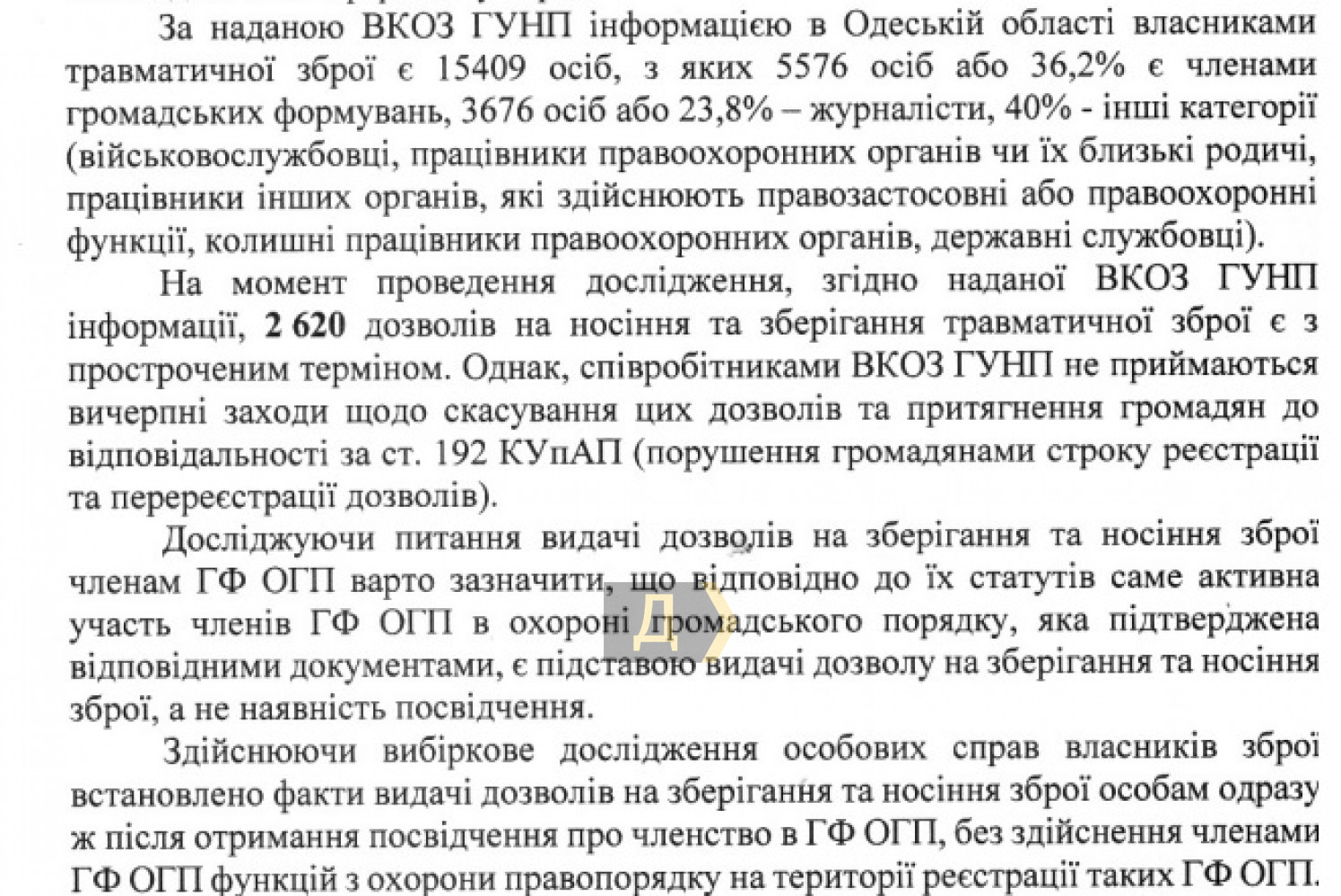 В Одесской области — 15 с лишним тысяч обладателей травматов: четверть из них - «журналисты»15409 жителей Одесской области располагают легальным травматическим оружием. Это выяснили аудиторы МВД, которые недавно проверяли региональный главк полиции, сообщили «Думской» источники в правоохранительных органах. 5576 разрешений выдано членам так называемых гражданских формирований по охране общественного порядка — в основном это сотрудники частных охранных фирм. 3776 — журналистам, точнее, гражданам, которые сумели добыть соответствующую корочку: насколько известно «Думской», у большинства одесских работников пера, диктофона и камеры оружия нет. Остальные обладатели травматических пистолетов — военные, прокуроры, полицейские, судьи, госслужащие и близкие родственники полицейских и судей. Аудиторы установили, что во многих случаях разрешения выдавали незаконно. Например, члены упомянутых «гражданских формирований» могут получить травмат только после прохождения специальной подготовки либо в полиции, либо в Государственной пограничной службе. А потом обязаны активно помогать охранять тот самый порядок или государственную границу. Никто, понятное дело, по этому поводу не заморачивается. Таких организаций в Одесской области, кстати, аж 99. Аналогичная ситуация и с «журналистами». Примерно 90% разрешений выдано людям, которые не просто не работают в редакциях, а и двух слов связать не могут. В том числе устно. За последнее десятилетие в Украине появились сотни «СМИ», вся деятельность которых сводится к продаже удостоверений, позволяющих получить травматическое оружие. Участвует в этом прибыльном бизнесе и Национальный союз журналистов Украины (руководитель одесского подразделения — Юрий Работин). Потом многие стволы всплывают в уголовных производствах, в том числе открытых по террористическим и «антигосударственным» статьям. Аудиторы, не напрягаясь, выявили 53 факта выдачи разрешений на травматы «журналистам» несуществующих изданий «Шевченковская панорама» и «М.А.G.NUM». И это лишь верхушка айсберга. Отметим, что ситуацией сейчас занимается ГБР, открывшее уголовное производство под №62021150020000204. Незаконную выдачу разрешений на оружие следователи бюро квалифицировали по 364-й статье Уголовного кодекса — как злоупотребление властью или служебным положением. Впрочем, правового механизма аннулирования таких разрешений нет, поэтому псевдожурналисты и лжеактивисты, владеющие травматами, могут не беспокоиться – никто оружие у них не заберет. Автор — Георгий Ак-Мурза СМЕРТЬ РОСІЙСЬКИМ ОКУПАНТАМ! Помітили помилку? Виділяйте слова з помилкою та натискайте control-enter Новини по цій темі: 29 липня 2025: В Усатово Одеської області сталася перестрілка: поліція працює на місці (відео, оновлено) 28 липня 2025: П'яний на "Ягуарі" або гіпертонік? Звільнений топ-посадовець одеської поліції хоче повернутися на службу 19 червня 2025: Дівчинку, яку шукали сотні одеситів, знайшли вбитою: поліція працює з чоловіком, ймовірно причетним до загибелі 27 травня 2025: Увели гектар в університету: на Одещині засудили земельних аферистів, але без посадки і Хвоста |