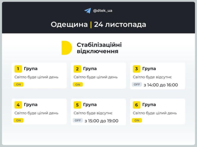 В Одеській області 24 листопада буде більше світла (графіки відключень, оновлено)Графіки відключень електроенергії діятимуть завтра в Одеській області тільки у двох групах і по кілька годин. Як повідомили у пресслужбі ДТЕК, світла не буде в 4-й групі з 14:00 до 17:00 і в 6-й з 16:00 до 19:00. В інших групах електроенергію вимикати не будуть. ОНОВЛЕНО о 20:45. У ДТЕК змінили графіки відключень. Згідно з новими, світла не буде в 3-й групі з 14:00 до 16:00 і в 5-й з 15:00 до 19:00. Помітили помилку? Виділяйте слова з помилкою та натискайте control-enter |