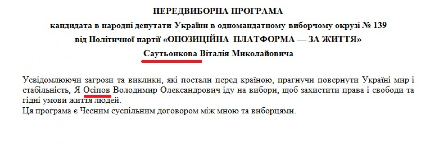В Одесской области мажоритарщики от «Оппоплатформы» списали программу друг у друга: некоторые даже не изменили имяАбсолютно одинаковые программы подали в ЦИК мажоритарщики от партии «Оппозиционная платформа — За жизнь». Более того, как минимум один из них представился именем другого кандидата. Так, кандидат в народные депутаты Виталий Саутенков, который баллотируется по 139 округу с центром в Раздельной, написал в программе: «Я, Осипов Владимир Александрович». Впрочем, объясняется эта странность просто. Несмотря на то, что сама программа представляет собой сокращенный вариант партийной, кандидат Саутенков поленился самостоятельно написать даже вступительный абзац, взял программу своего коллеги по партии, зарегистрированного кандидатом в 137 округе (Подольск), и забыл изменить ФИО. К слову, личные цели участия в парламентских выборах у «оппозиционеров» тоже совпадают. Читайте также: Климов не поменял ни одной буквы в своей предвыборной программе с 2014 года СМЕРТЬ РОСІЙСЬКИМ ОКУПАНТАМ! Помітили помилку? Виділяйте слова з помилкою та натискайте control-enter