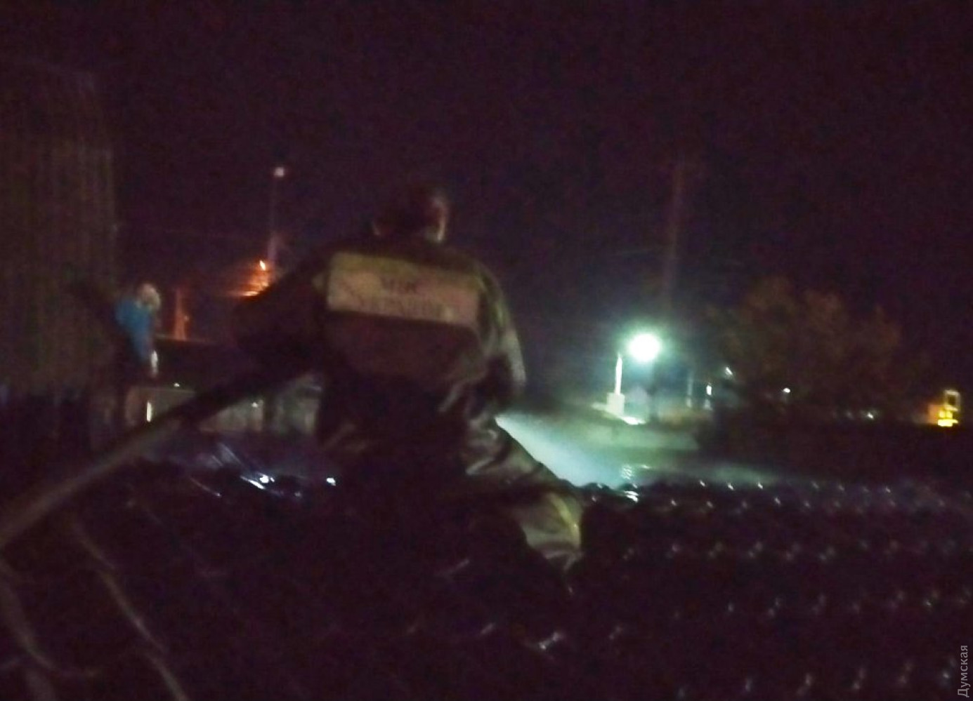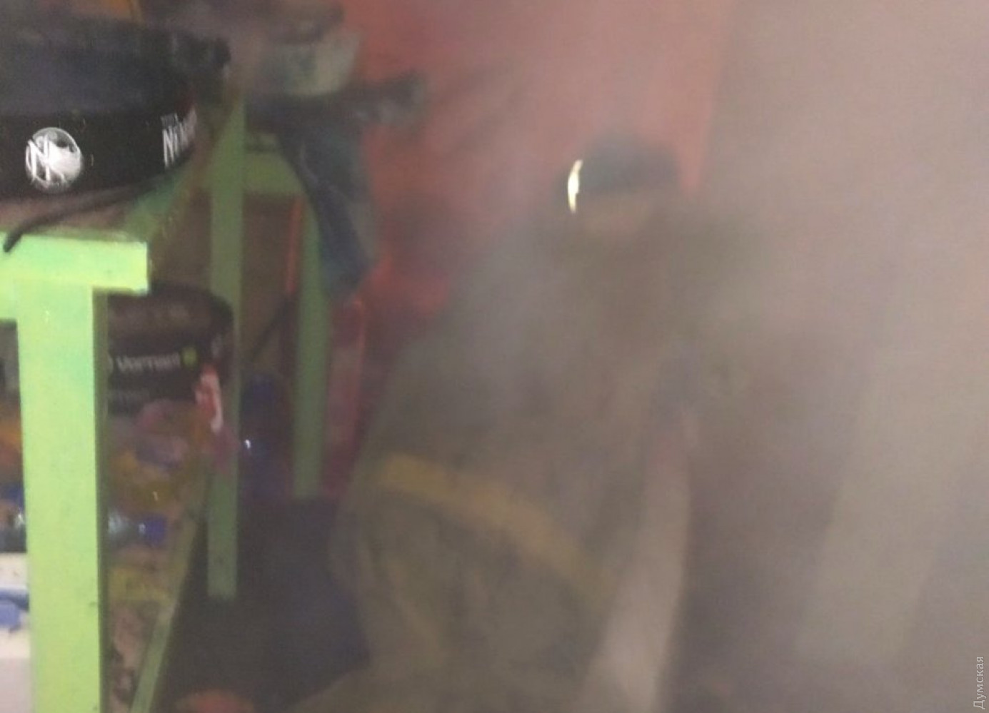 В этом помещении был пожар вследствие атаки. Спасатели до сих пор проливают.