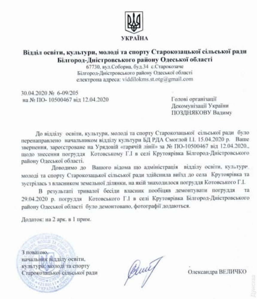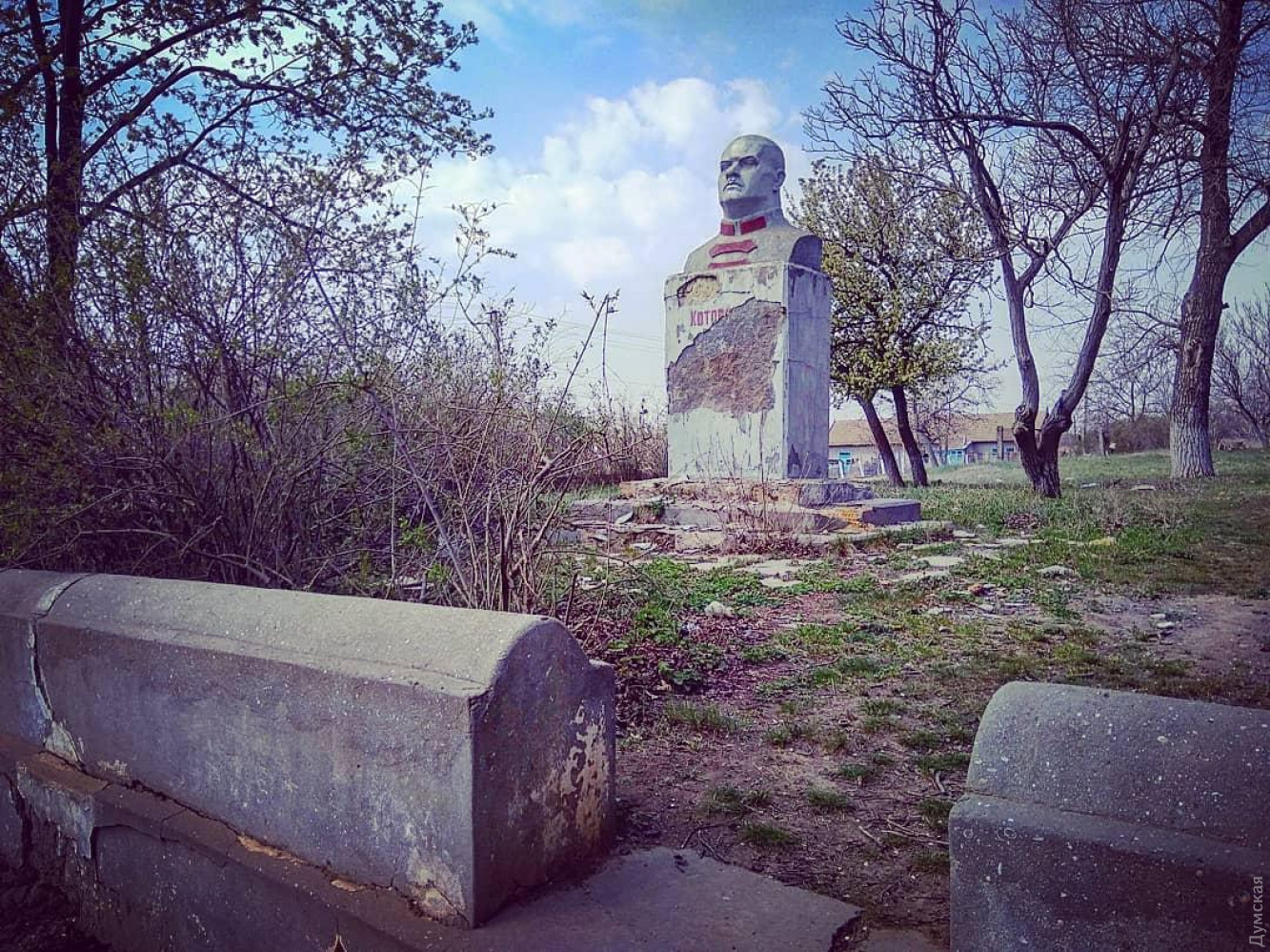 Памятник большевистскому военачальнику Григорию Котовскому демонтировали в селе Крутояровка Белгород-Днестровского района Одесской области. Об этом со ссылкой на руководителя отдела образования, культуры, молодежи и спорта Старокозацкой ОТГ Александра Величко сообщила группа «Декоммунизация. Украина». По словам чиновника, бюст находился на частной земле, но собственника удалось убедить его убрать, что было сделано 29 апреля. Фото Ивана Савченко СМЕРТЬ РОСІЙСЬКИМ ОКУПАНТАМ! Помітили помилку? Виділяйте слова з помилкою та натискайте control-enter Новини по цій темі: 24 вересня 2025: Така різна декомунізація: в Одесі перейменували парк, дві вулиці та розбили погруддя Посмітного 19 травня 2025: Розбита дошка Маринеско і погрози «головному» Пушкіну: деколонізатори не відступають попри побої |