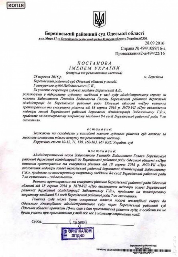 Березовский районный суд Одесской области отменил как незаконное решение местного райсовета о недоверии главе РГА Геннадию Заболотному, принятое на сессии 18 августа. Об этом «Думской» сообщили в администрации. По мнению суда, вотум был принят с нарушением процедуры и регламента совета. Напомним, за недоверие проголосовали 25 из 34 депутатов собрания. «Формальным поводом стало признание неудовлетворительным отчета о работе Заболотного с сентября 2015 по июль 2016 года. На самом же деле недоверие выразили из-за активной борьбы главы РГА с коррупционными схемами», — отметили в администрации. Отметим, что, по данным «Думской», голосование стало возможным благодаря давней дружбе местного «ОппоБлока» и «Батькивщины». 50-летний Геннадий Заболотный — уроженец Гайворона Кировоградской области. В 1990 году окончил Кировоградский институт машиностроения, потом занимался бизнесом. Был депутатом Кировоградского областного совета, а также членом исполнительного комитета города Кировограда (Кропивницкого). Заболотный является президентом Федерации легкой атлетики Кировоградской области. Женат, воспитывает троих детей. СМЕРТЬ РОСІЙСЬКИМ ОКУПАНТАМ! Помітили помилку? Виділяйте слова з помилкою та натискайте control-enter |