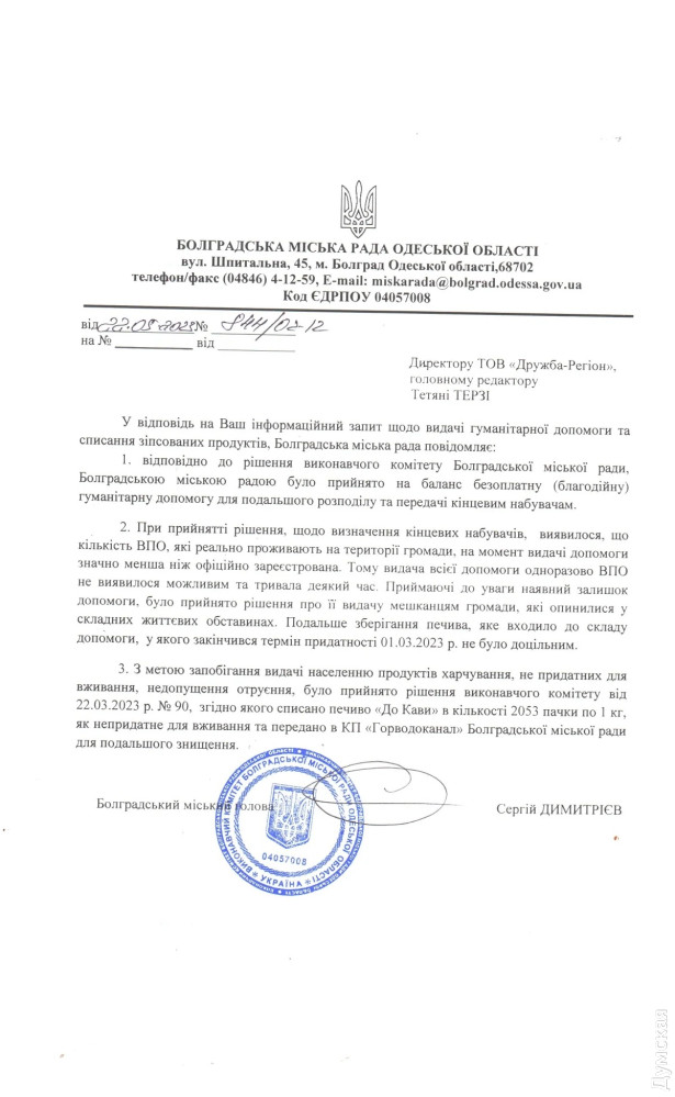 За рішенням керівництва Болградської районної державної адміністрації було знищено дві тонни (2053 пачки) печива «До кави», яке поставили в громаду як гуманітарну допомогу переселенцям.