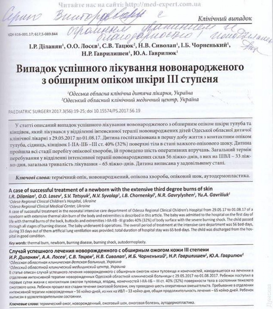 Врачи Одесской областной детской больницы столкнулись с нестандартным случаем — к ним поступил новорожденный первых суток жизни, получивший обширный ожог туловища и конечностей. В результате длительного лечения малыш выжил.