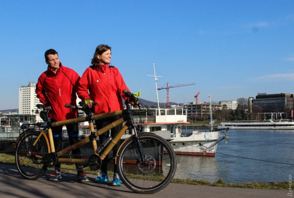 В Одессу на самодельном велосипеде-тандеме из бамбука прибыли экологисты из Европы — полька Ева Грижик и австриец Роланд Клосс.