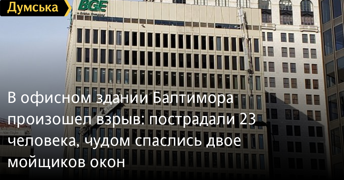 В офисном здании Балтимора произошел взрыв: пострадали 23 человека, чудом спаслись двое мойщиков оконВ центре американского города Балтимор, штат Мэриленд, в многоэтажном офисном здании произошел взрыв, в результате которого пострадали 23 человека. По данным пожарной службы, инцидент произошел на 16 этаже в офисе компании Baltimore Gas & Electric. Что стало причиной взрыва, пока неизвестно, но в компании заверяют, что газ тут не при чем.