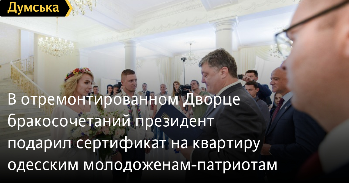 В отремонтированном Дворце бракосочетаний президент подарил сертификат на квартиру одесским молодоженам-патриотамВо время своей рабочей поездки в Одессу президент Украины Петр Порошенко заглянул в отремонтированный Дворец торжественных событий на Ришельевской, 4 и поздравил с бракосочетанием молодоженов – волонтера Ирину Стасюк и «киборга» Сергея Тимановского, который участвовал в боевых действиях на Донбассе с 2014 года, в том числе, выполнял задачи по охране и обороне Донецкого аэропорта. Пара встретилась в зоне АТО: в июле 2015 года Сергей находился на ротации в Донецкой области, где познакомился с Ириной, которая в то время была волонтером и активно помогала его подразделению. Президент Порошенко поблагодарил молодоженов за то, что они сделали огромное благо для страны — защищали Украину от врага. На свадьбу глава государства пришел не с пустыми руками: молодоженам вручили сертификат на получение двухкомнатной квартиры. Фото и видео с сайта president.gov.ua СМЕРТЬ РОССИЙСКИМ ОККУПАНТАМ! Заметили ошибку? Выделяйте слова с ошибкой и нажимайте control-enter |