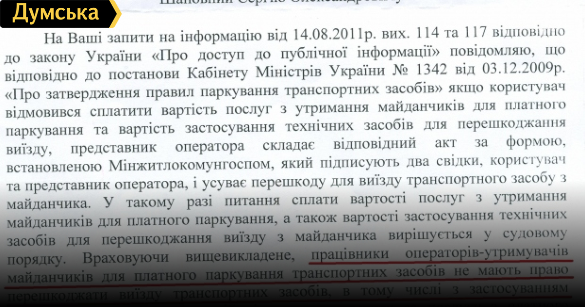 Об этом горожанам напомнил руководитель организации «Общественный контроль дорог» Сергей Дубенко. Также он приводит письмо КП «Парксервис», подтверждающее нелегальность использования шлагбаумов для задержания автомобилей неплательщиков.