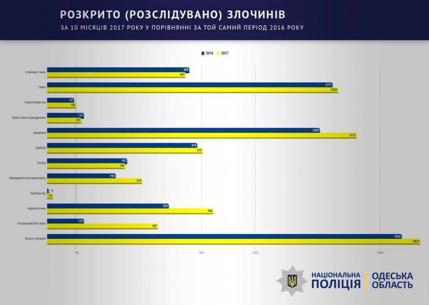 «Меня радует и то, что уменьшился уровень грабежей (на 41%) и разбоев (на 35,8%). Это означает, что Одесская область стала более безопасным регионом», — отметил Дмитрий Головин.