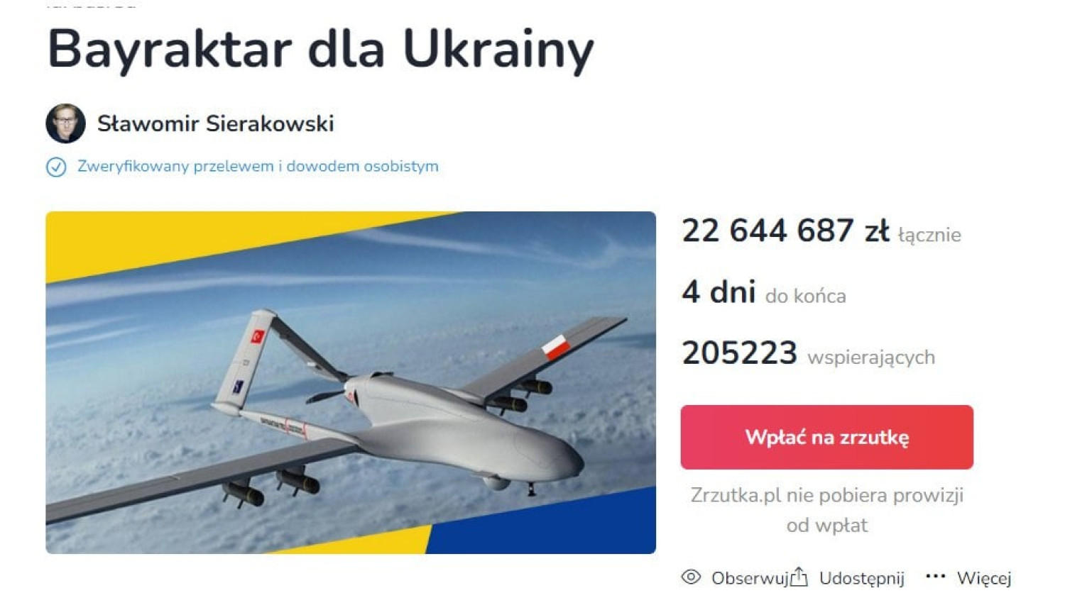 "…В Польщі зібрали п'ять мільйонів долларів на «Байрактар» для українських захисників…»