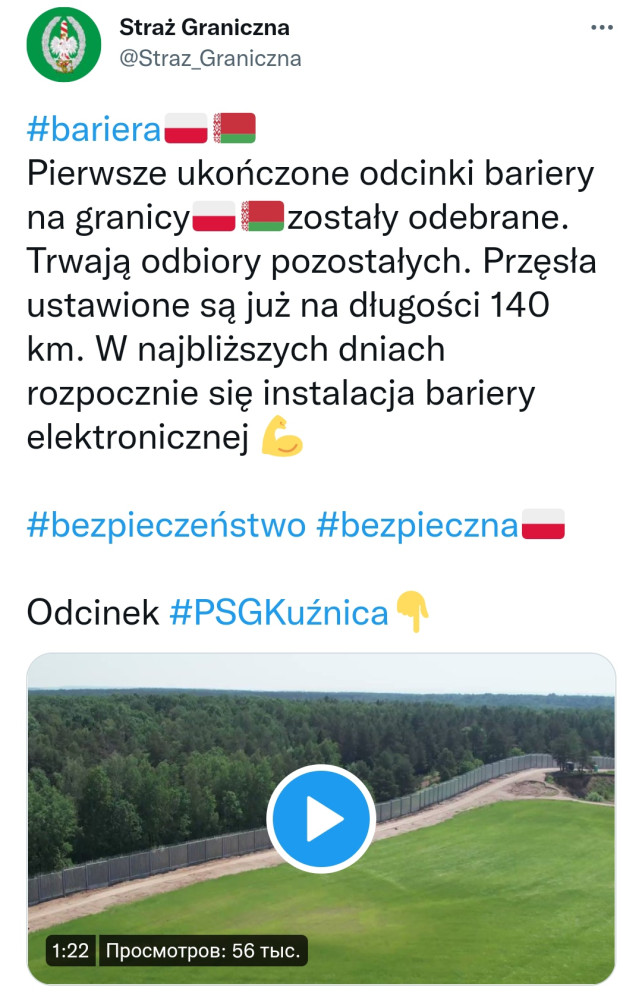 В Польше построили уже 140-километровый отрезок заграждения на границе с беларусью. Как сообщает Пограничная служба Польши в Твиттере, уже началась сдача в эксплуатацию первых участков стены. В ведомстве отмечают, что в ближайшие дни начнется установка электронных шлагбаумов. Общая протяженность забора составит 186 километров, а высота – пять метров. Общая стоимость проекта достигнет 1,6 млрд злотых — около 400 млн долларов. Закончить строительство планируют до 30 июня этого года. Помітили помилку? Виділяйте слова з помилкою та натискайте control-enter |