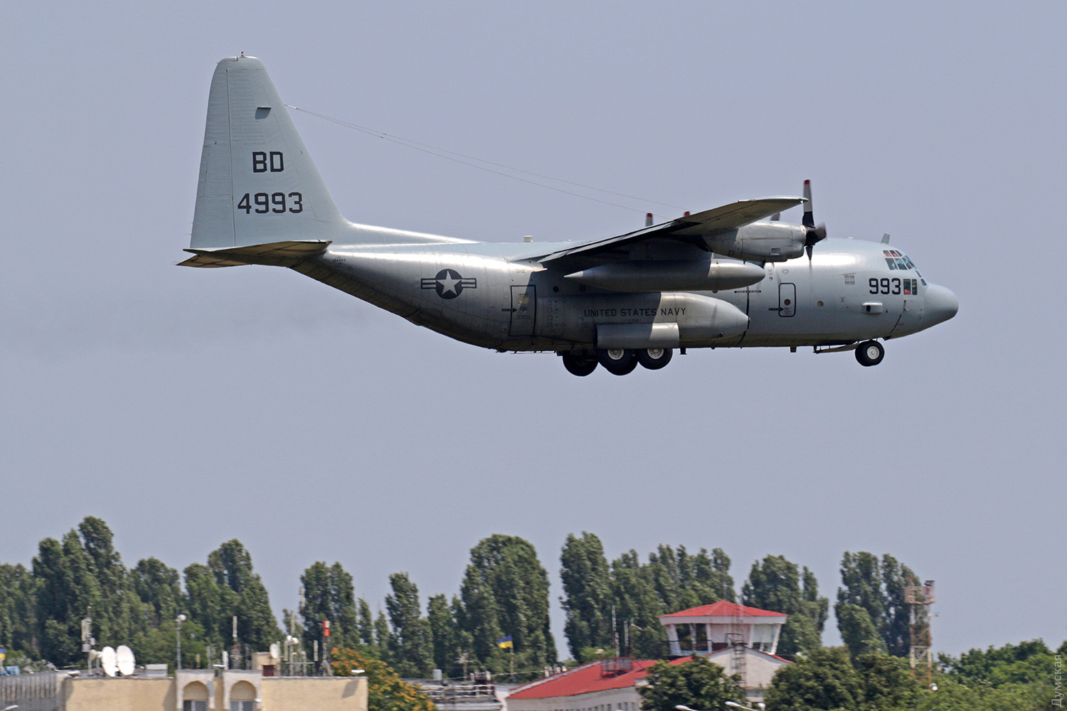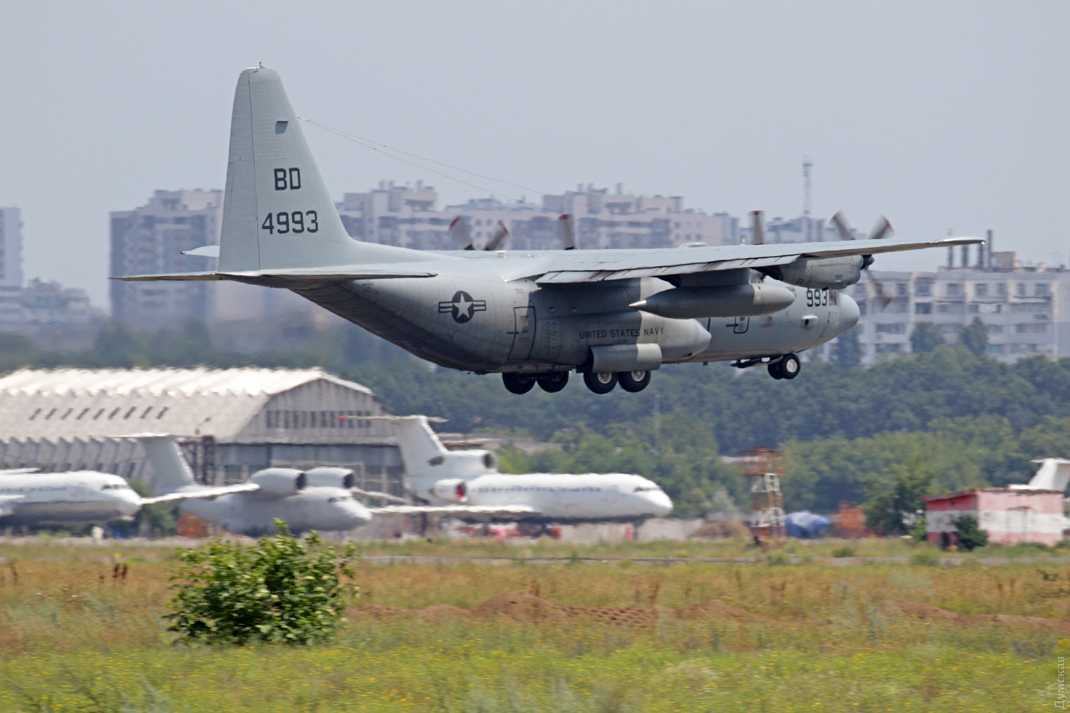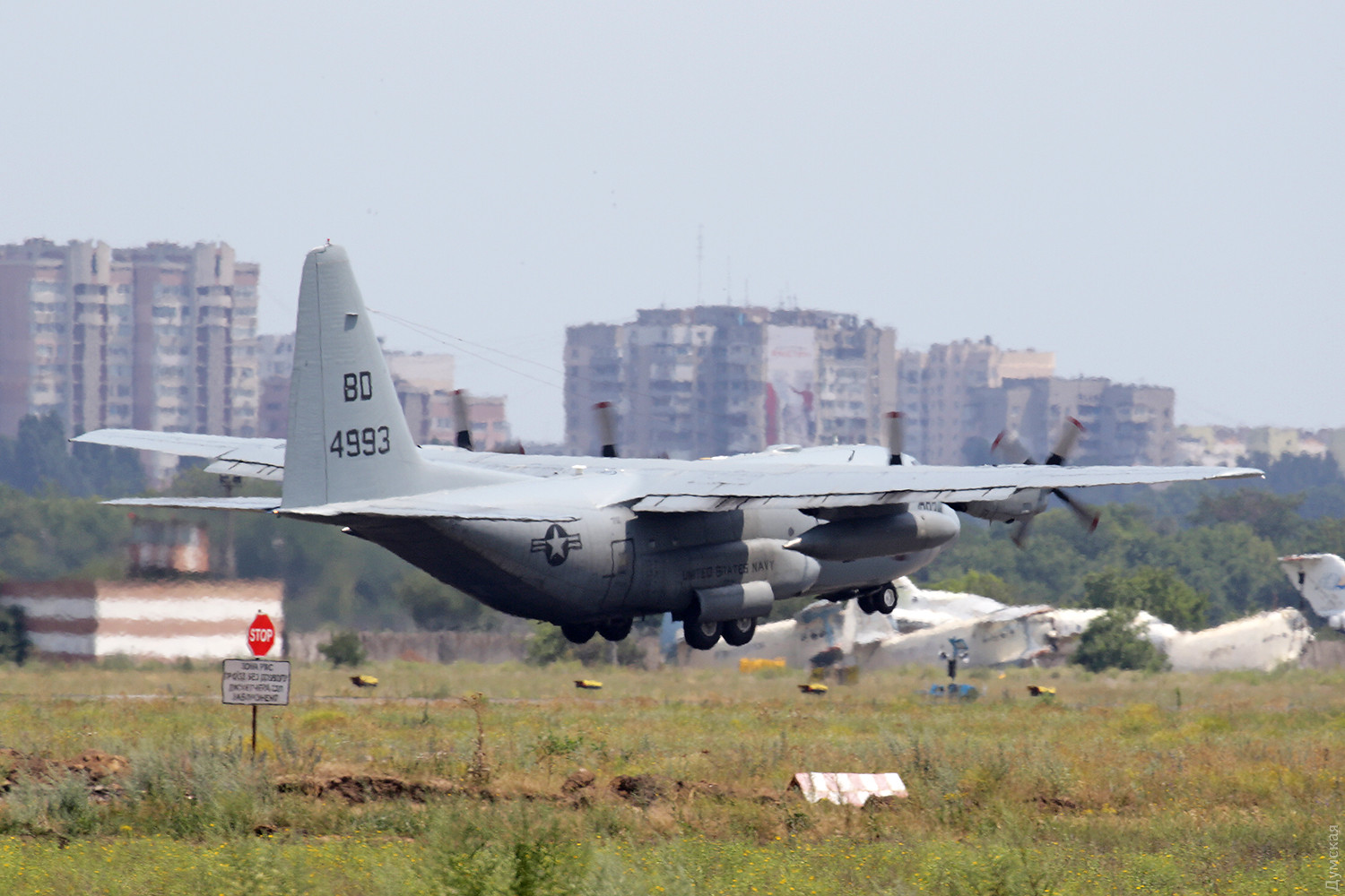 Продолжаются прилеты в одесский аэропорт тяжелой транспортной авиации. Сегодня днем у нас приземлился очередной американский «Геркулес», который привез морпехов и оборудование для учений. Самолет относится к эскадрилье VR-64 Condors и осуществляет доставку различного снаряжения по всему миру в интересах американских Военно-морских сил.
