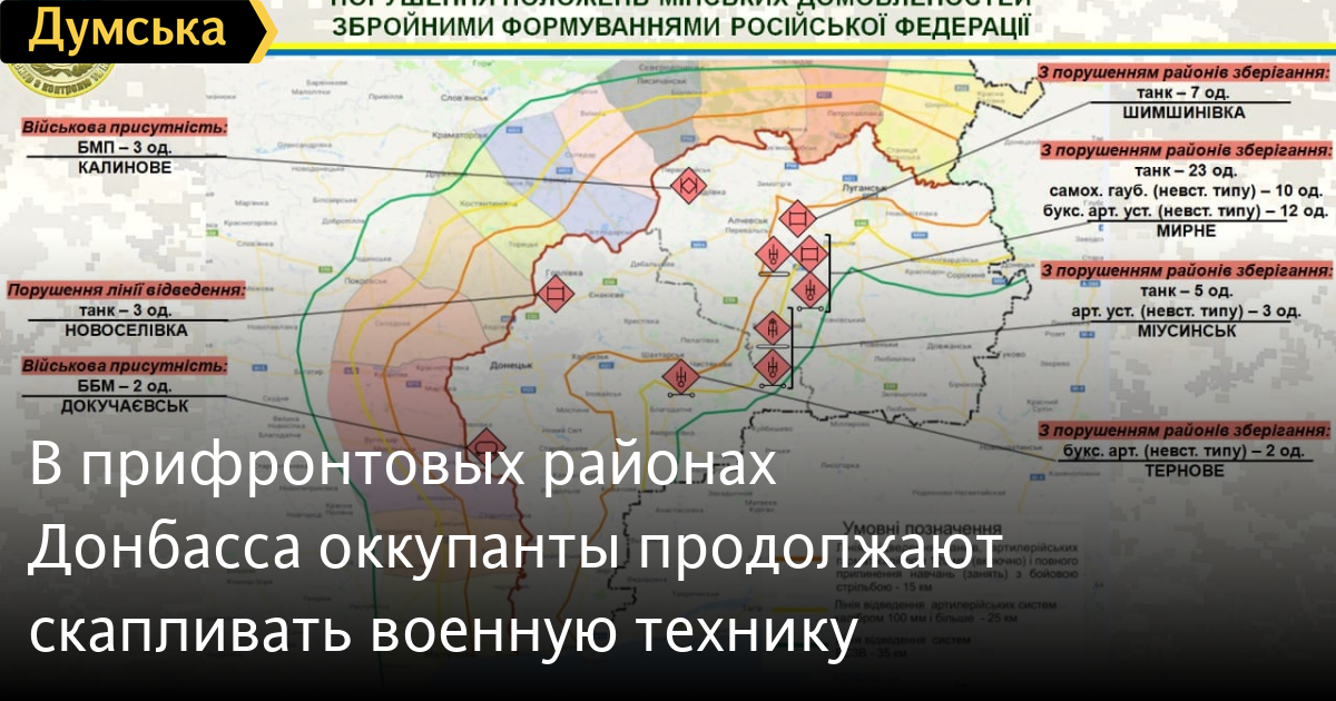 В прифронтовых районах Донбасса оккупанты продолжают скапливать военную техникуУкраинская сторона Совместного центра по контролю и координации режима прекращения огня продолжает фиксировать нарушения Минских договоренностей со стороны российско-оккупационных формирований. Как сообщили в Генштабе Вооруженных сил Украины, в течение минувших суток представители СЦКК обнаружили 70 единиц вражеской техники в непосредственной близости к линии разграничения на Донбассе. Так, на территории 1-го армейского корпуса армии РФ (оккупированная часть Донецкой области) в районе Новоселовки (37 км от фронта) стоят три танка, в Докучаевске (30 км от фронта) заметили две бронемашины, а в Терновом (57 км от фронта) – две буксируемые артиллерийские установки. В зоне 2-го армейского корпуса (неподконтрольные районы Луганской области) у Миусинска (62 км от фронта) заметили три артустановки и пять танков. У Мирного (28 км от фронта) стоят 10 самоходных гаубиц и 12 буксируемых пушек, у Шимшиновки (27 км от линии разграничения) – семь танков, вблизи Калиново (60 км от фронта) – три БМП. «Подразделения Объединенных сил держат ситуацию под контролем», — сообщили в Генштабе. СМЕРТЬ РОССИЙСКИМ ОККУПАНТАМ! Заметили ошибку? Выделяйте слова с ошибкой и нажимайте control-enter |